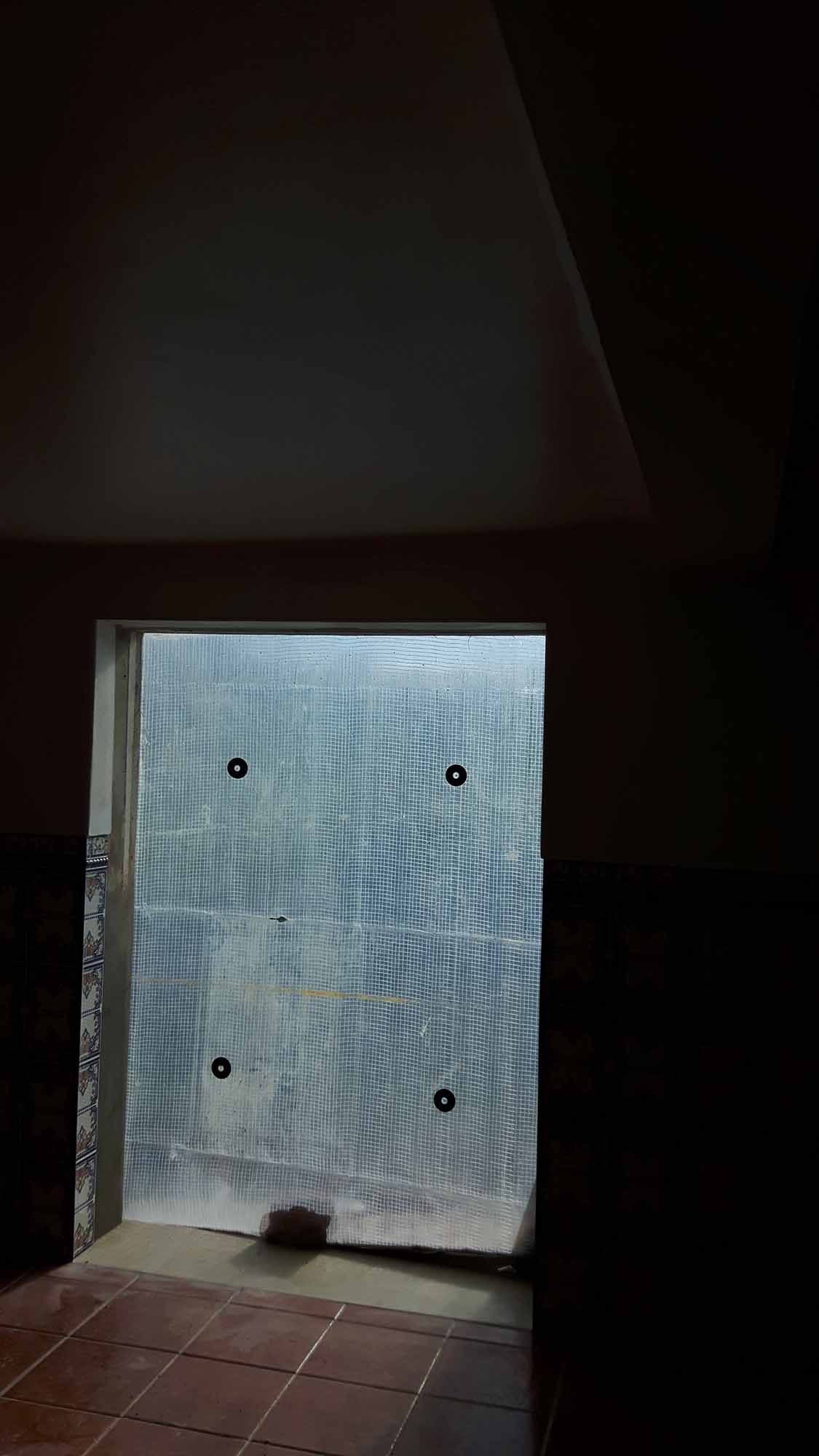 Omdat we graag aan twee kanten van het huis een gezellig sfeertje willen creëren, laten we door de Portugese vaklui een gat in de muur zagen voor nieuwe openslaande deuren. Dit is nog een hele opgave, omdat we graag willen dat zo min mogelijk originele tegels aan diggelen gaan. Het moet allemaal netjes worden afgewerkt, alsof het altijd al zo gezeten heeft.