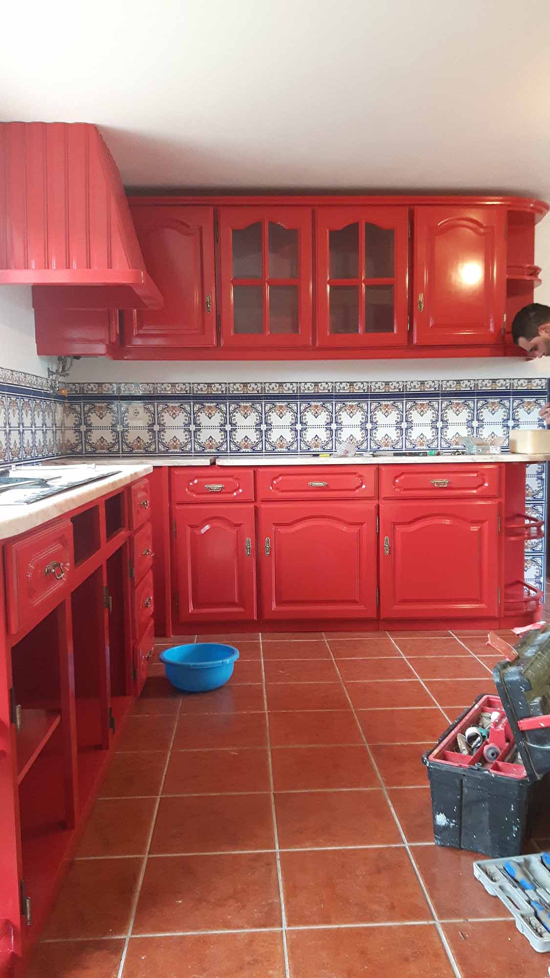 Hij staat! Vanmiddag dan eindelijk. En wat een kleur. Toen we weggingen zaten nog niet alle deurtjes erin, maar het aanblik is toch aardig definitief. Morgen komen António, Joanna, José en Odette, voor de middaghapjes. Scherpe tijden of niet?