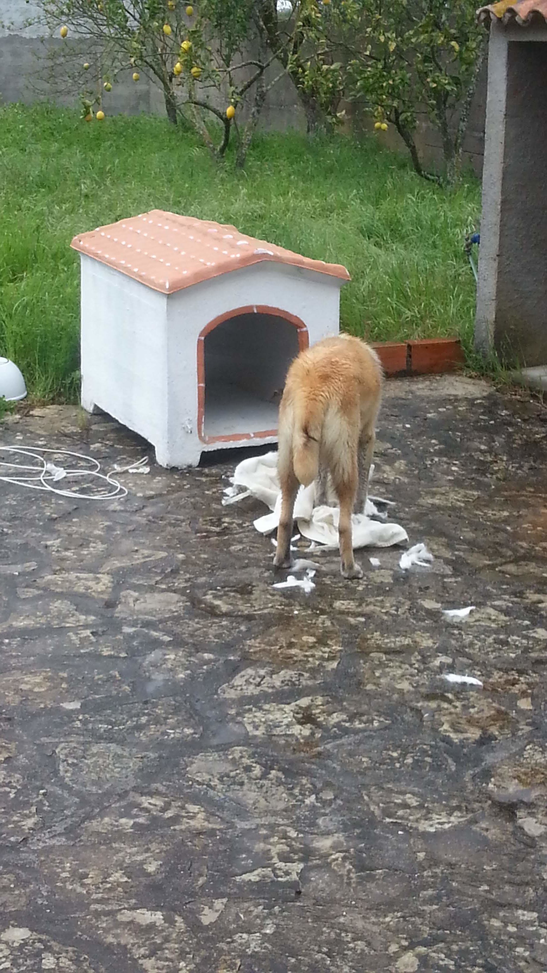 We zijn weer terug. Voor Karma hebben we een hondenhok gekocht en Betty heeft een dekentje voor Karma om op te liggen. Karma heeft er andere ideeën bij. Ze ligt sowieso liever op het gras, in de regen.