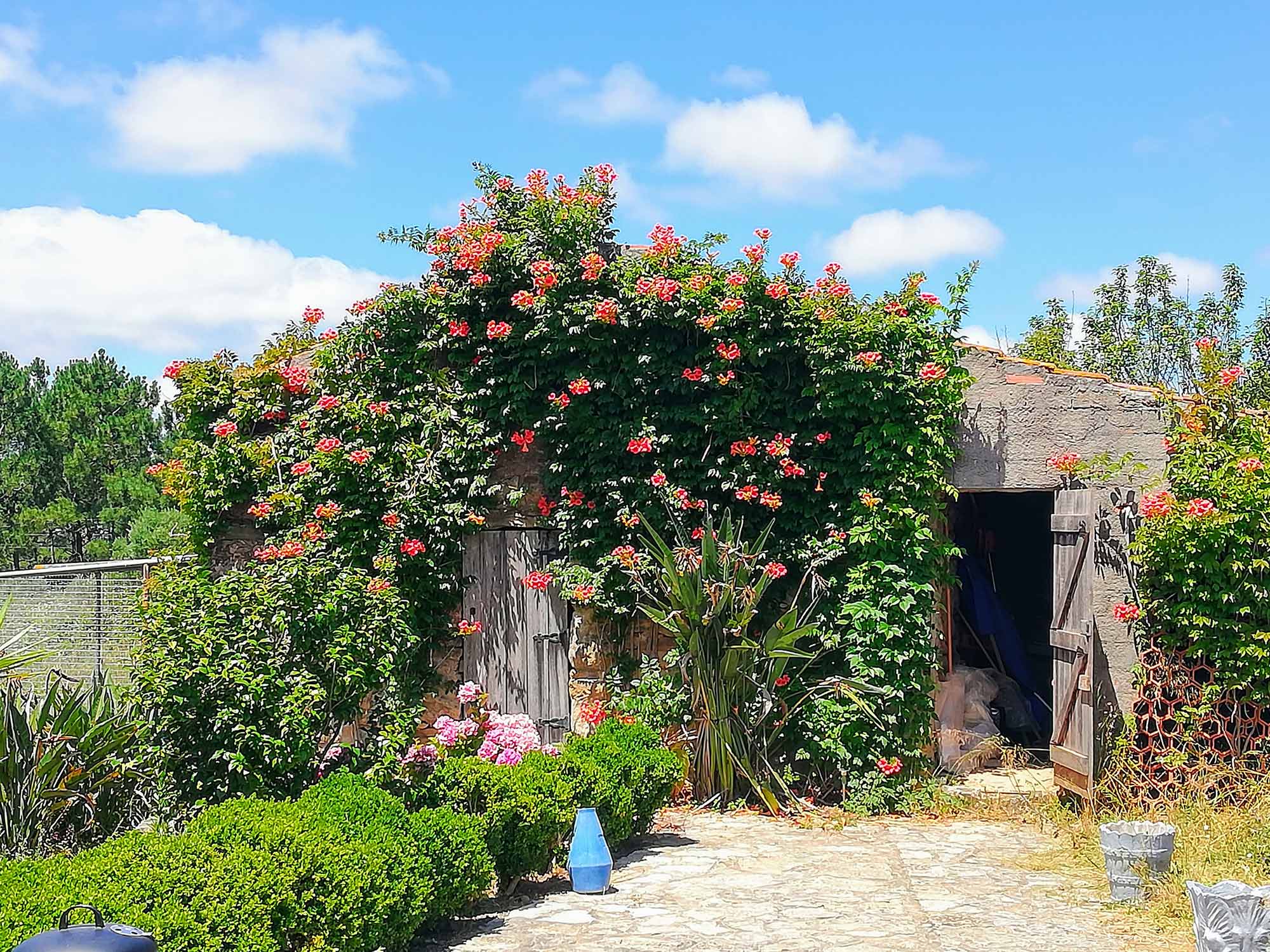 Het ‘oude huis’ is overwoekerd met prachtig bloeiende planten. Het komt in de zon prachtig tot uiting.