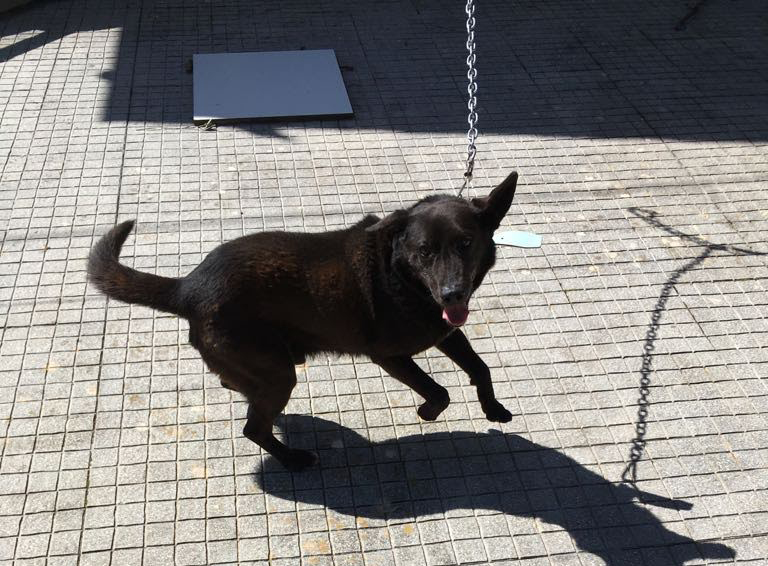 Hier zit Xarique nog aan de ketting bij Betty, maar inmiddels loopt hij rond op het terrein bij ons. Als een kind zo blij! Het arme dier heeft zo goed als zijn hele leven vastgezeten en nu loopt hij lekker rond te drentelen. Karma is wel jaloers en vindt het maar zo-zo.