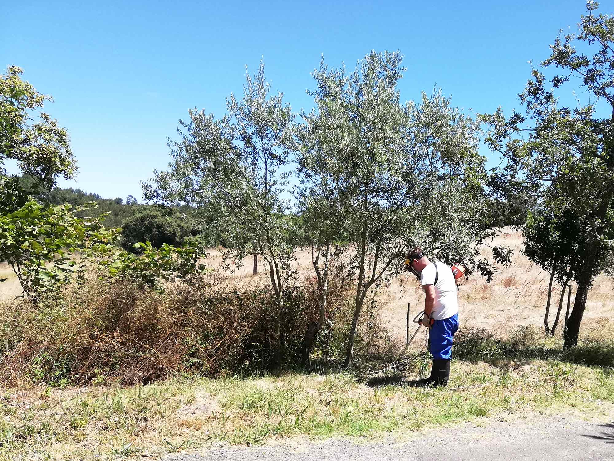 Het onkruid, of als je wilt het lage struikgewas, staat overal flink hoog, dus er moet stevig gemaaid worden. Elke dag een beetje zorgt ervoor dat het uiteindelijk allemaal afkomt. Niet de hele dag doormaaien hoor. Een paar uur per dag, tot de zon te heet wordt. Lekker om te doen hoor, lekker buiten in een lekker zonnetje.