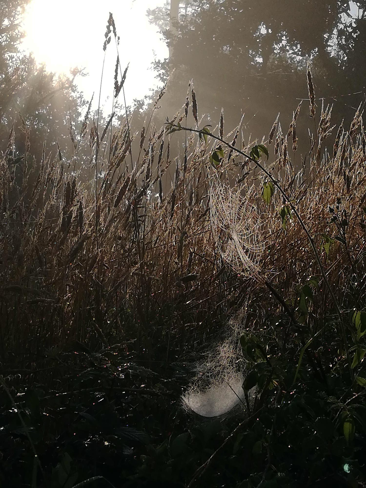 Het lijkt of de herfst al is begonnen, maar het is nog vroeg in het jaar, het is tenslotte pas augustus. ’s Ochtends is het wel al herfstig met de spinnenwebben in de ochtenddauw bij de eerste zon. Straks komt de zon goed door en is het weer zomer. ’n Prachtige periode van het jaar en ’t levert mooie plaatjes op.