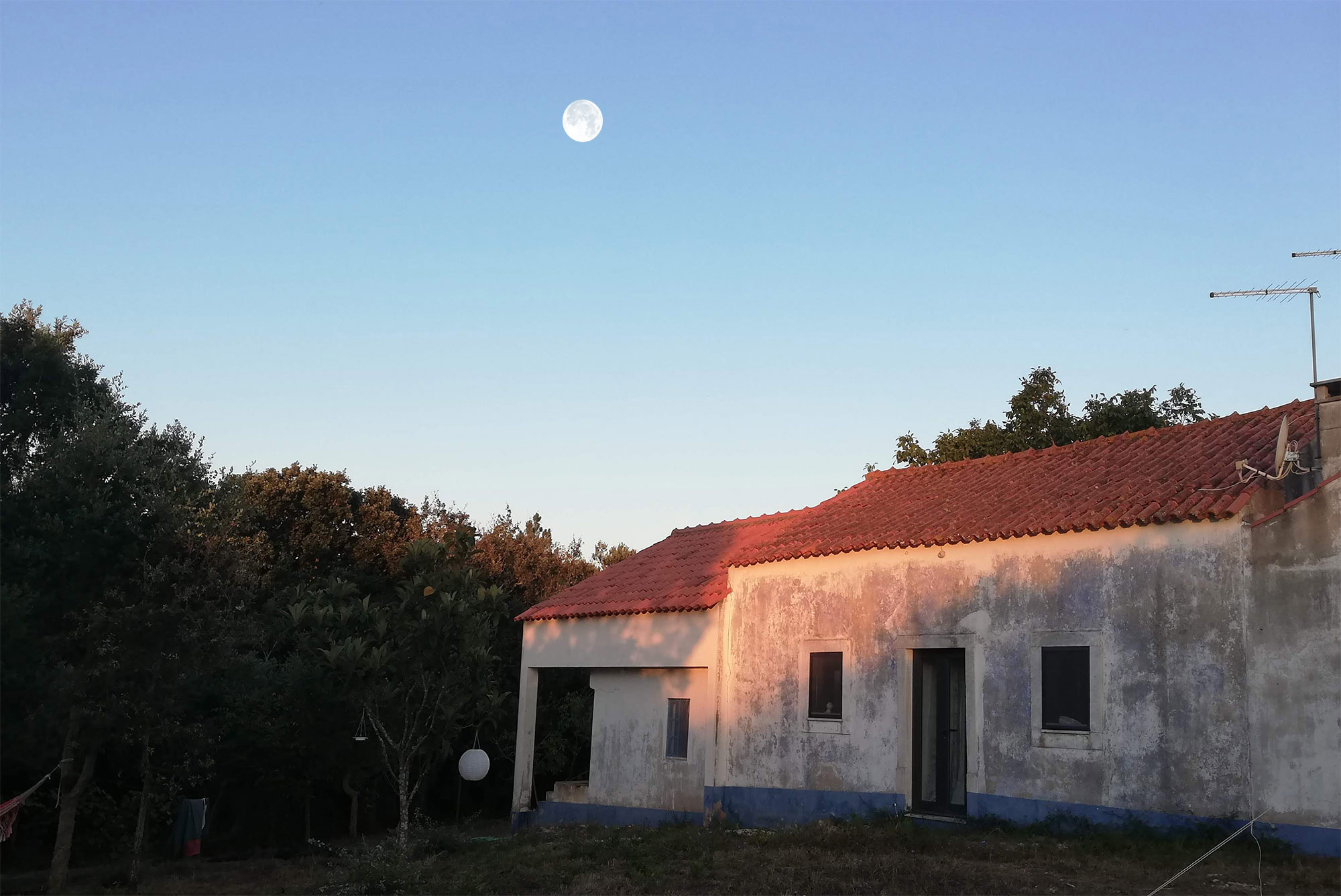 Net als de zon is opgekomen is de volle maan nog zichtbaar. Het ziet er erg mooi uit zo. De foto is een beetje gemanipuleerd, om het te laten zien zoals het ’s ochtends op je over komt. De lucht is nog warm, maar niet heet. Heerlijk voor een ochtendwandeling met de honden.