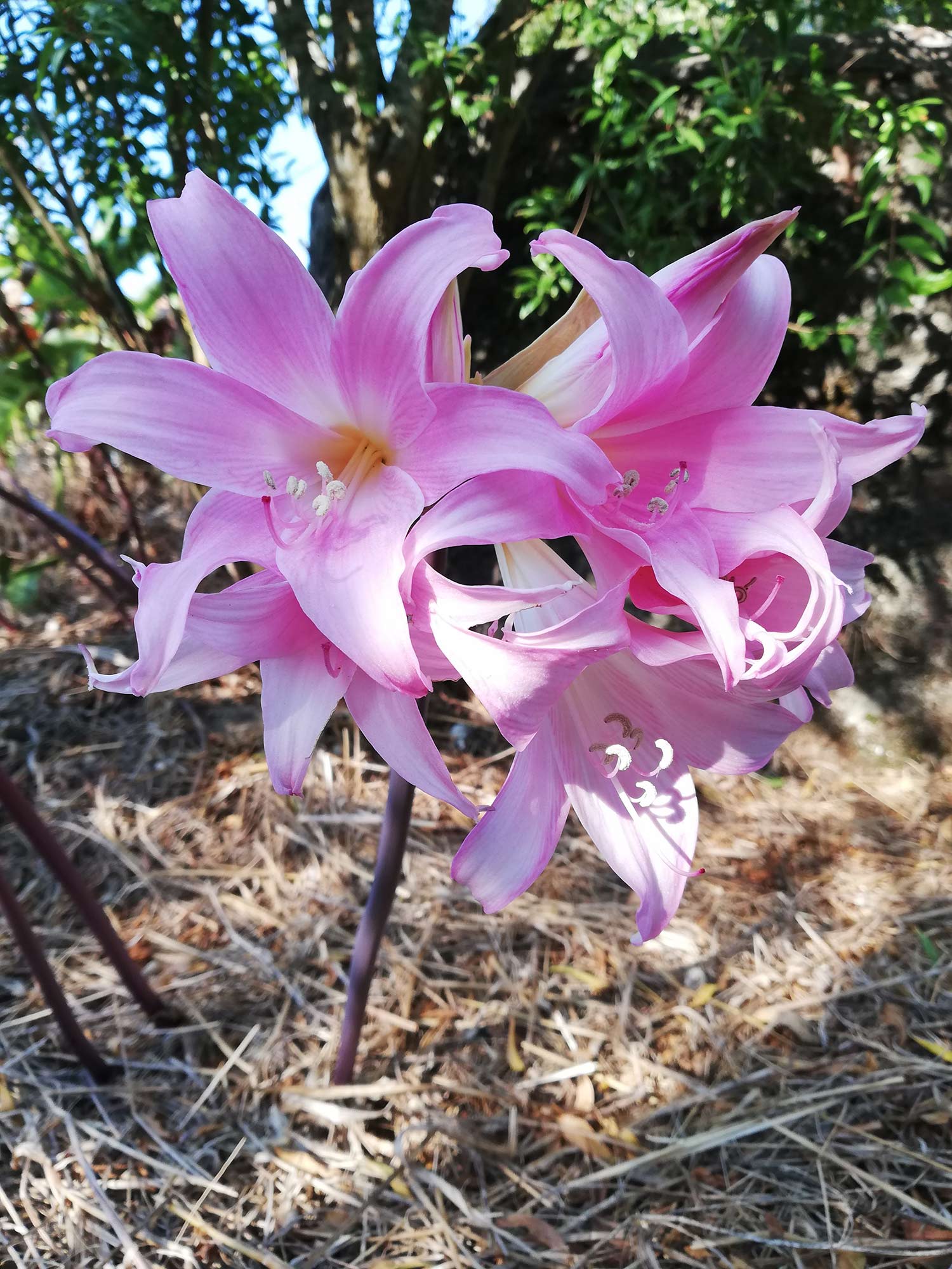 Deze komen zomaar uit het niets. Plotseling staan ze midden op het land te bloeien. En niet één, er staan er een stuk of tien. Het zijn een soort wilde amaryllissen. Ik heb het opgezocht: Amaryllis belladona, en ik geloof dat de Portugese naam “Meisjes naar school” is. Vriendelijke naam toch. Je ziet ze in parken staan en zo, maar ik had niet verwacht dat ze spontaan bij ons op het terrein zouden komen.