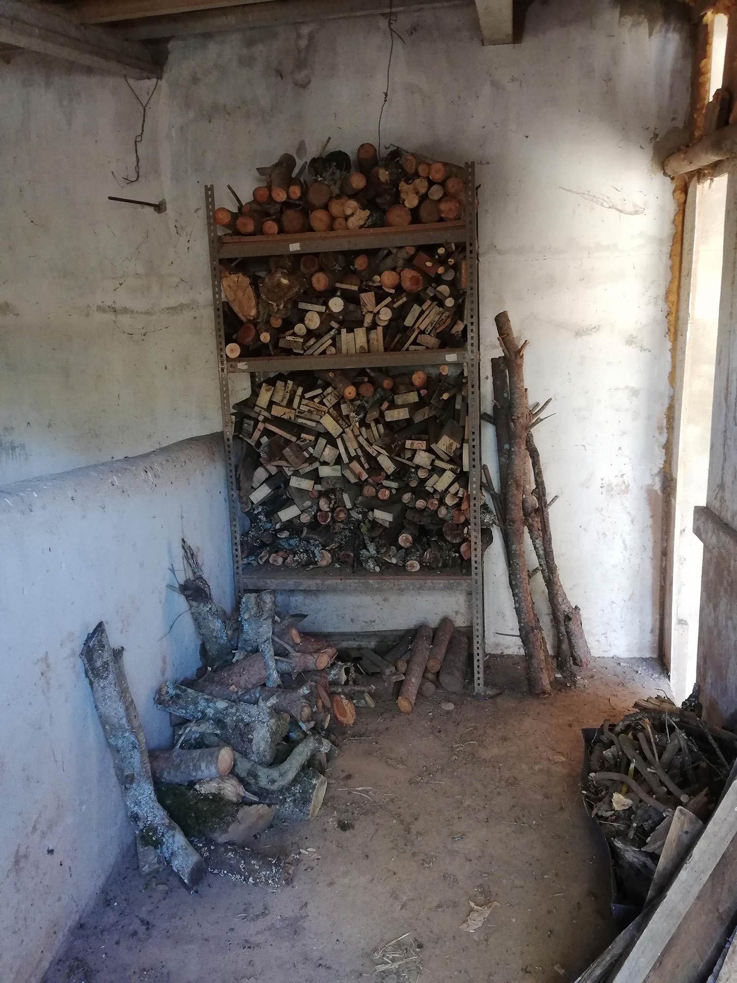 Toen we het huis net hadden, zijn er meteen flink wat bomen gesnoeid. Het hout dat daarbij vrij kwam hadden we een beetje slordigweg tegen het huis aangelegd. Onder de trap die naar de zolder gaat. Maar, uiteindelijk niet zo verstandig want erg brandgevaarlijk.