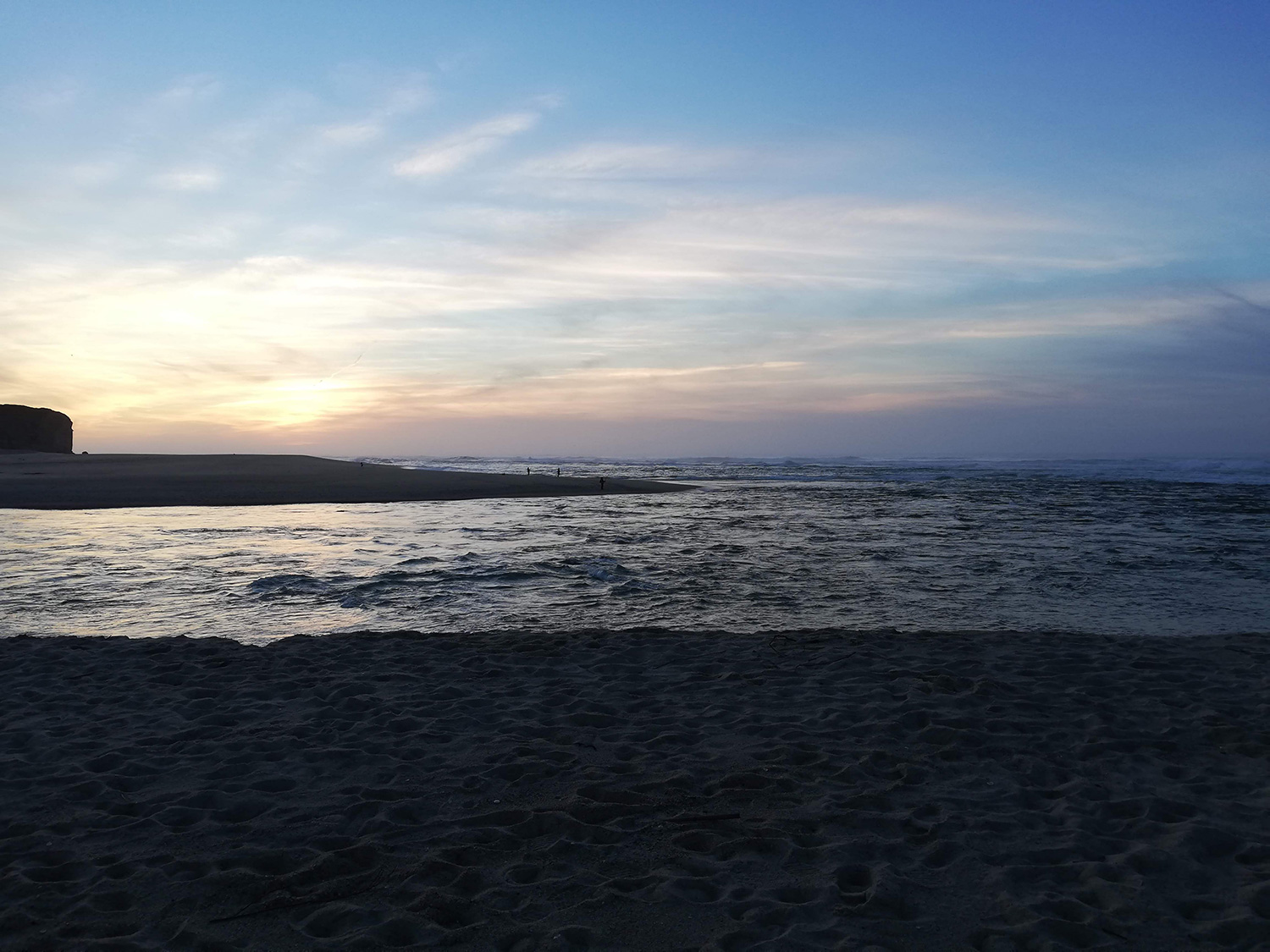 Prachtig gezicht in Foz do Arhelho. De lagune komt hier uit op zee, de doorgang is niet zo groot. Het is nu laag water dus het stroomt flink. Het is een beetje bewolkte dag, dus de zon zelf zie je niet erg, maar de wolkenlucht is wel prachtig gekleurd.