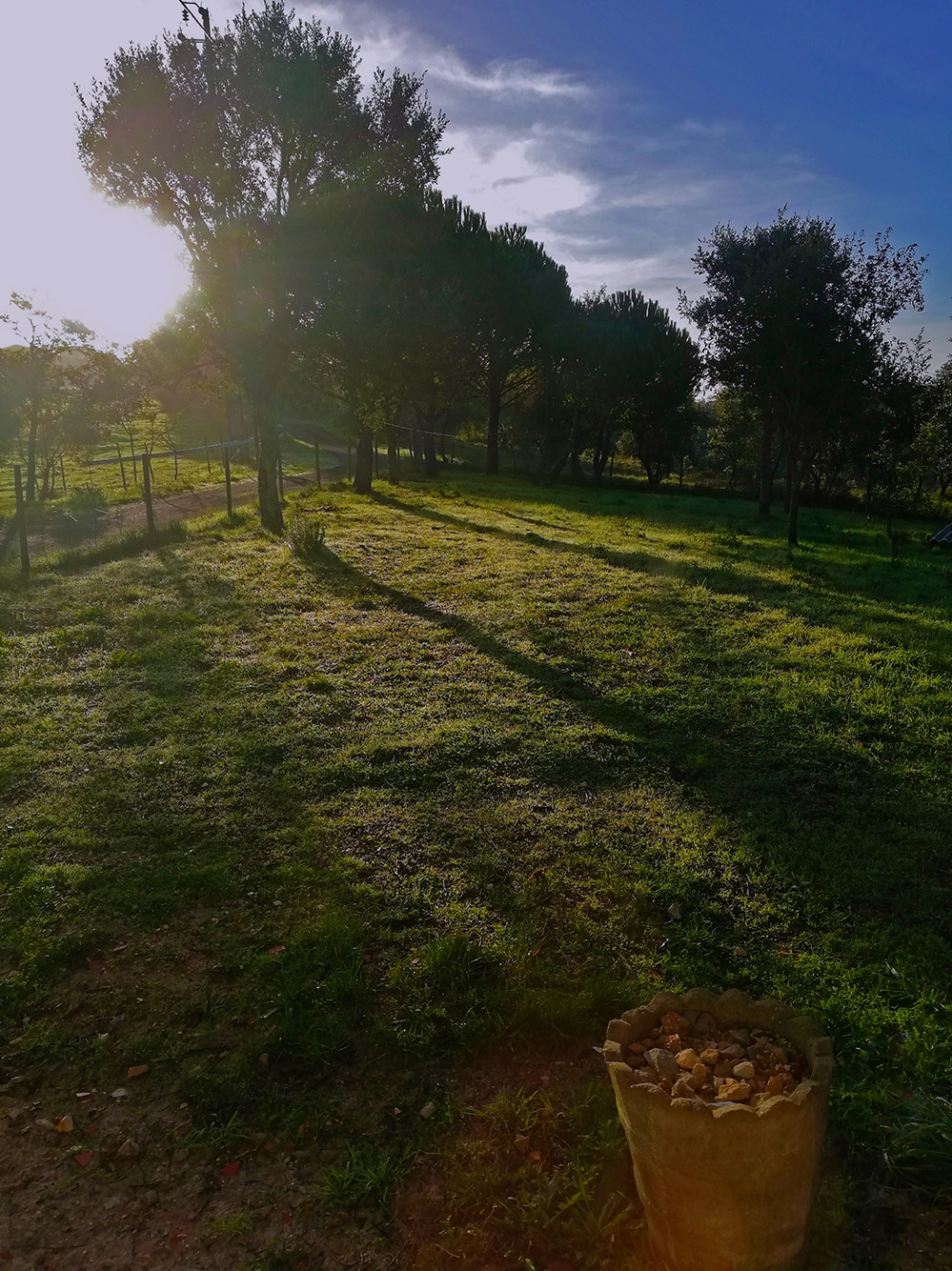 Als de zon net boven de heuvel komt, even voor achten, dan zie je mooie lange schaduwen. Ook al is het begin december, toch heeft de zon al kracht, zo vroeg in de morgen. Het belooft weer een mooie dag te worden. Gewoon in je T-shirt een beetje buiten op het terrein werken. Mooi toch.