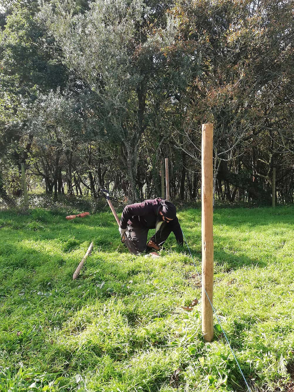 Binnenkort gaan we een geit kopen. Die moet het terrein een beetje kaal houden, want voor je het weet staat er anderhalve meter van van alles en nog wat. Samen met Miguel maak ik het het. Of eigenlijk Miguel maakt het en ik sta met hand- en spandiensten bij. Paal vasthouden, stukje meten enzovoorts. We delen het terrein in tweeën zodat de geit straks zijn gang kan gaan zonder dat de honden hem in zijn nek springen. De honden houden nog een fflink stuk over waar ze heen en weer kunnen rossen.