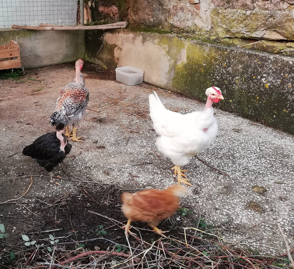 Vandaag aangekomen, onze nieuwe aanwinst, of beter aanwinsten: vier kippen, alle van een ander ras. Eigenlijk één haan en drie kippen, waarvan één eierleggend. Dat laatste moeten we nog zien, maar morgen weten we het. Miguel heeft vandaag het hek afgemaakt en meteen de kippen meegenomen. Hij had ook stro bij zich en voer voor de eerste dagen. Een kado voor Kerstmis, zegt-ie.