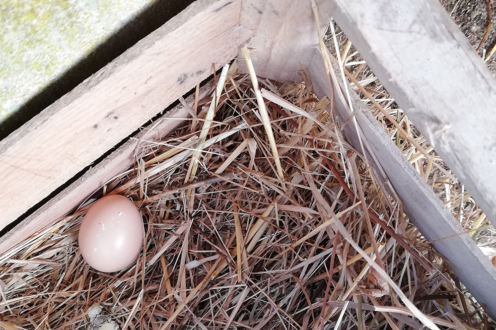 En gelukt! Vanmorgen het eerste ei van onze eigen kippen. En nog een prachtig exemplaar ook. Keurig in het kistje dat we ervoor neergezet hadden.