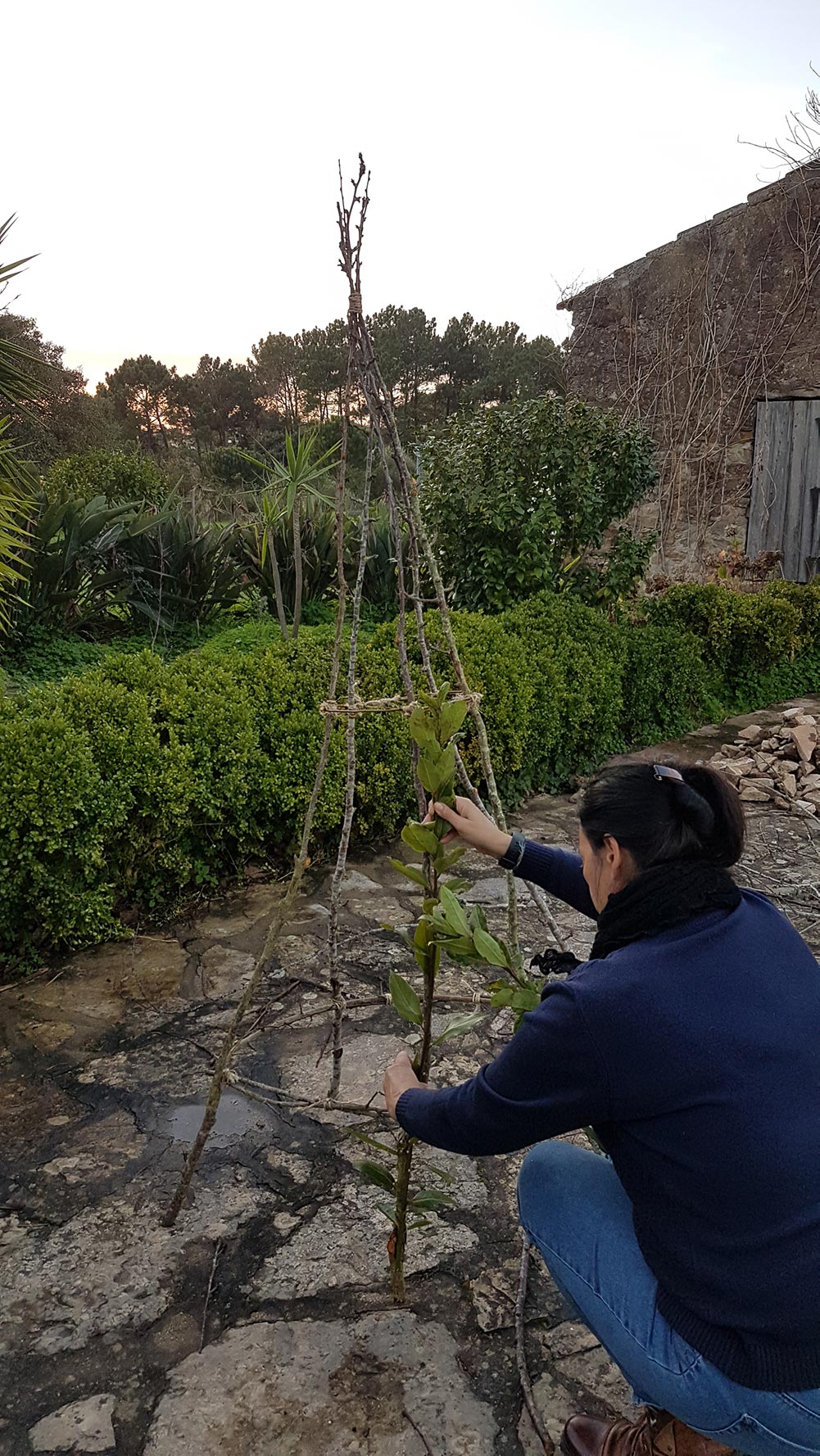 Aan Miguel vroegen we of er in Portugal kerstbomen te vinden waren. Hij keek meteen heel bedenkelijk. Nee, deze traditie kennen we niet. Miguel heeft lang in Duitsland gewoond en hij kent de traditie van winkels en tuincentra vol met kerstbomen. Ze zijn wel te krijgen in het noorden van Portugal, maar hier niet. Dus we gingen op zoek, naar een kunstkerstboom. Alleen maar lelijke en duur!. Dat gingen we dus maar niet doen. Marijn kwam op het briljante idee er zelf een te maken, hij dacht van hout en zo. Nog beter was iets te maken van takken die we toch nog hadden van de snoeipartij van een tijdje terug. Op de foto is de boom in de maak, morgen is het resultaat te zien.