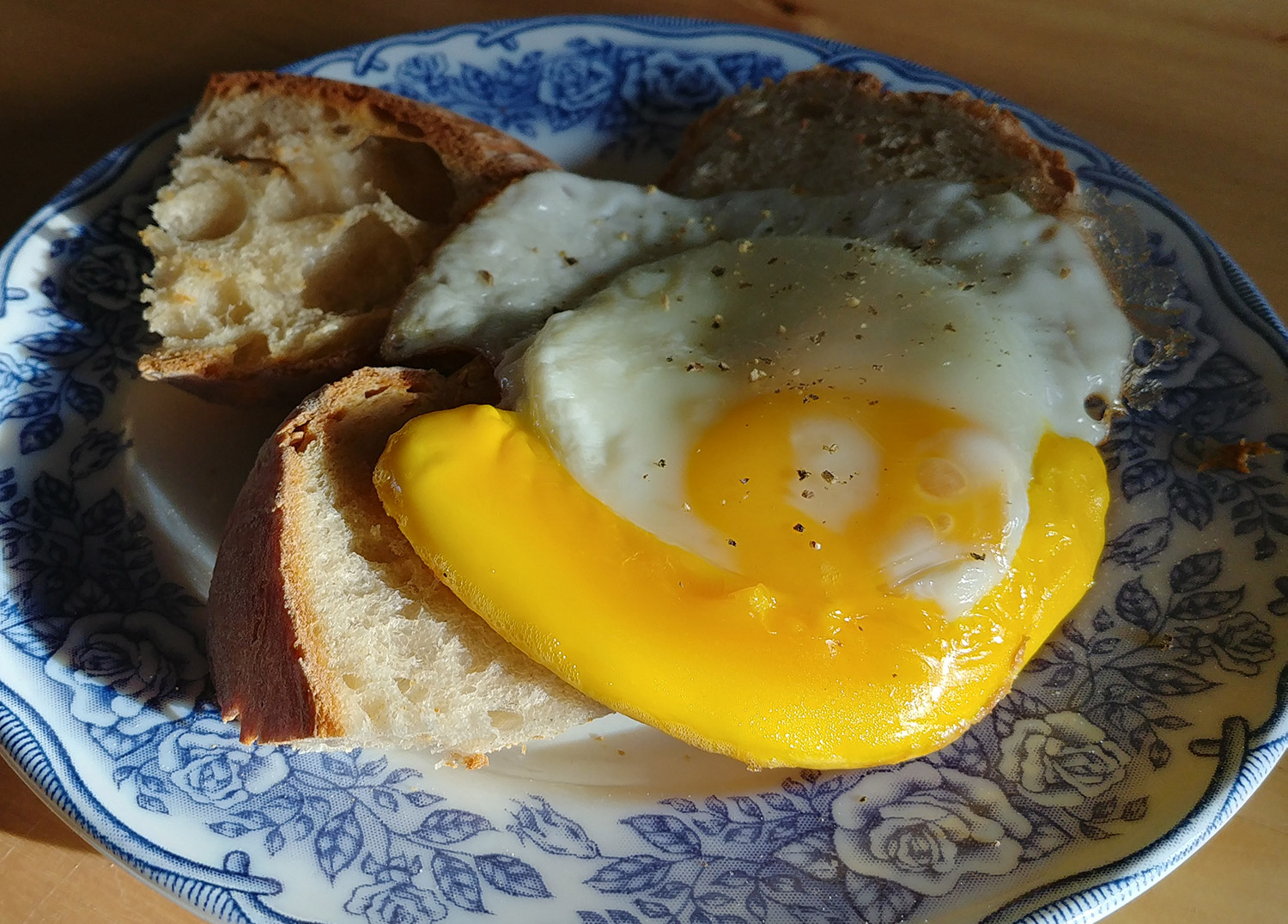 Tot nog toe elke dag een ei! Prachtig van onze eigen kip. En vanochtend klaargemaakt. Tezamen met die van de afgelopen dagen dus ieder zijn eigen gebakken ei.
