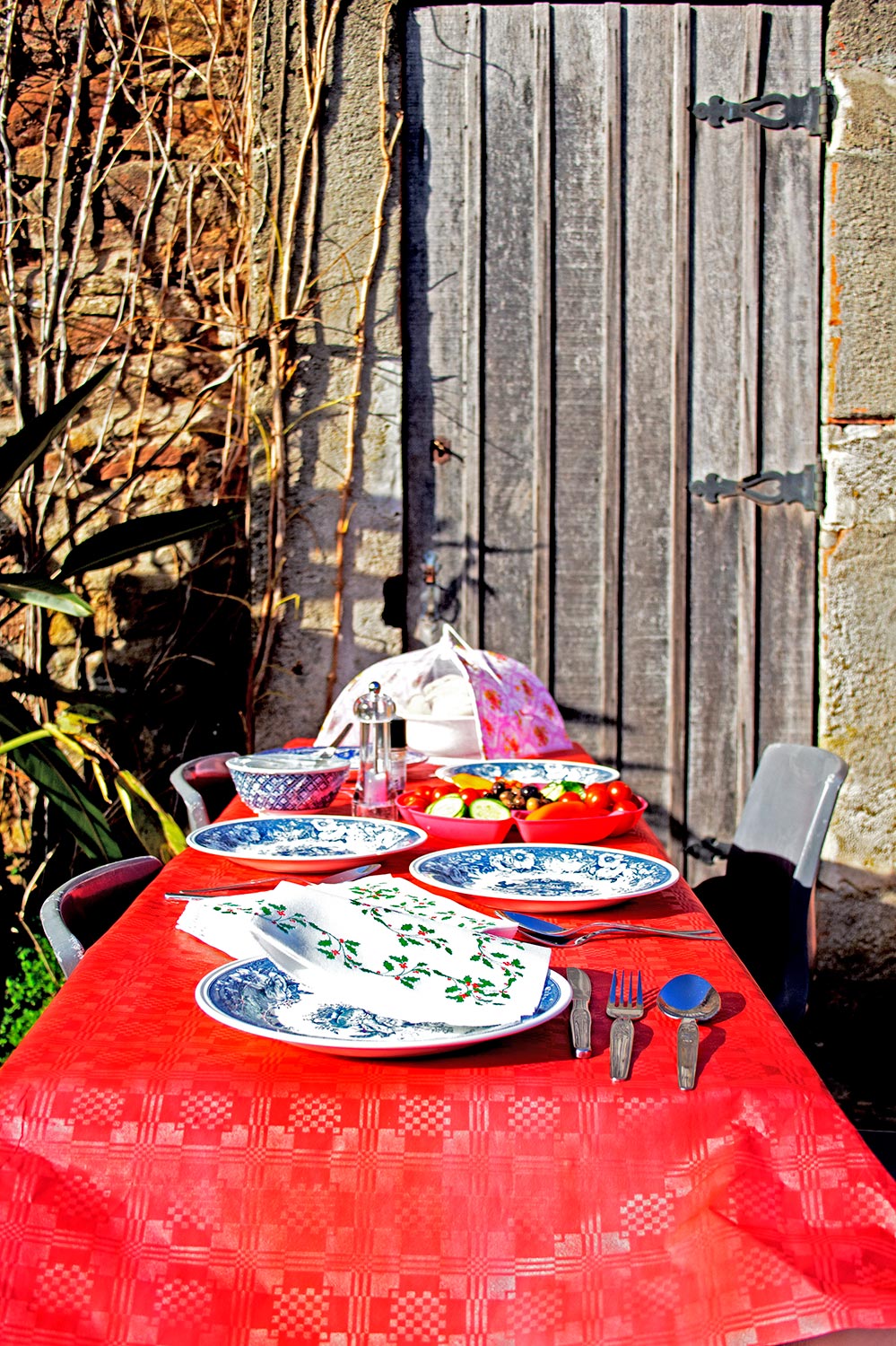 We wilden eerst binnen gaan zitten in het oude huis, dat we voor dat doel al hadden ingeruimd, maar de zon was zo lekker dat we besloten buiten te gaan eten. Roy kwam mee-eten, hij had zijn eigen Weber meegenomen, zodat we mooi vlees en vis gescheiden konden houden. De tafel stond tegen het oude huis, zodat we een beetje van de wind beschut waren, het woei niet zo hard, dus dat was mooi meegenomen, en we konden al die tijd in de zon zitten, tot zo’n uur of vier, dan begint te zon te zakken en wordt het te fris.