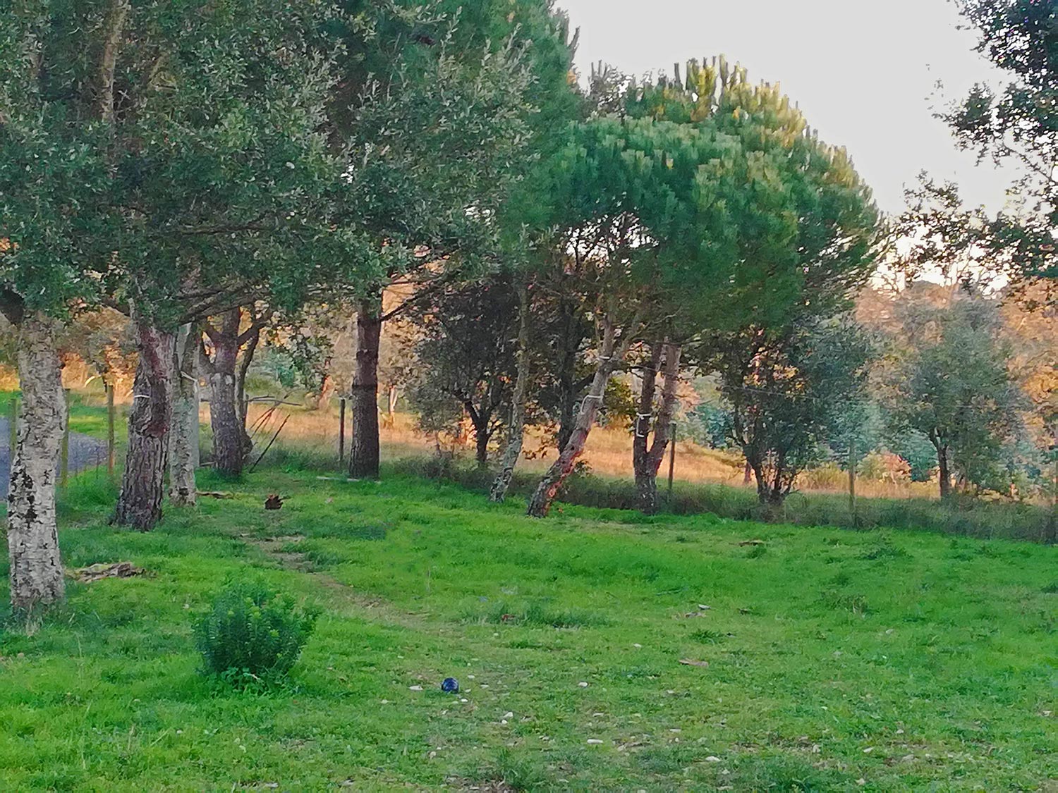 ’s Avonds gaat de zon onder achter het kurkeikenbos naast ons huis. Daardoor komt het terrein aan de voorkant wat eerder in de schaduw. ’t Mooie is dat het terrein daarachter nog vol in de zon staat, waardoor het wel lijkt te branden. Het is schitterend. En elke avond weer net even anders.
