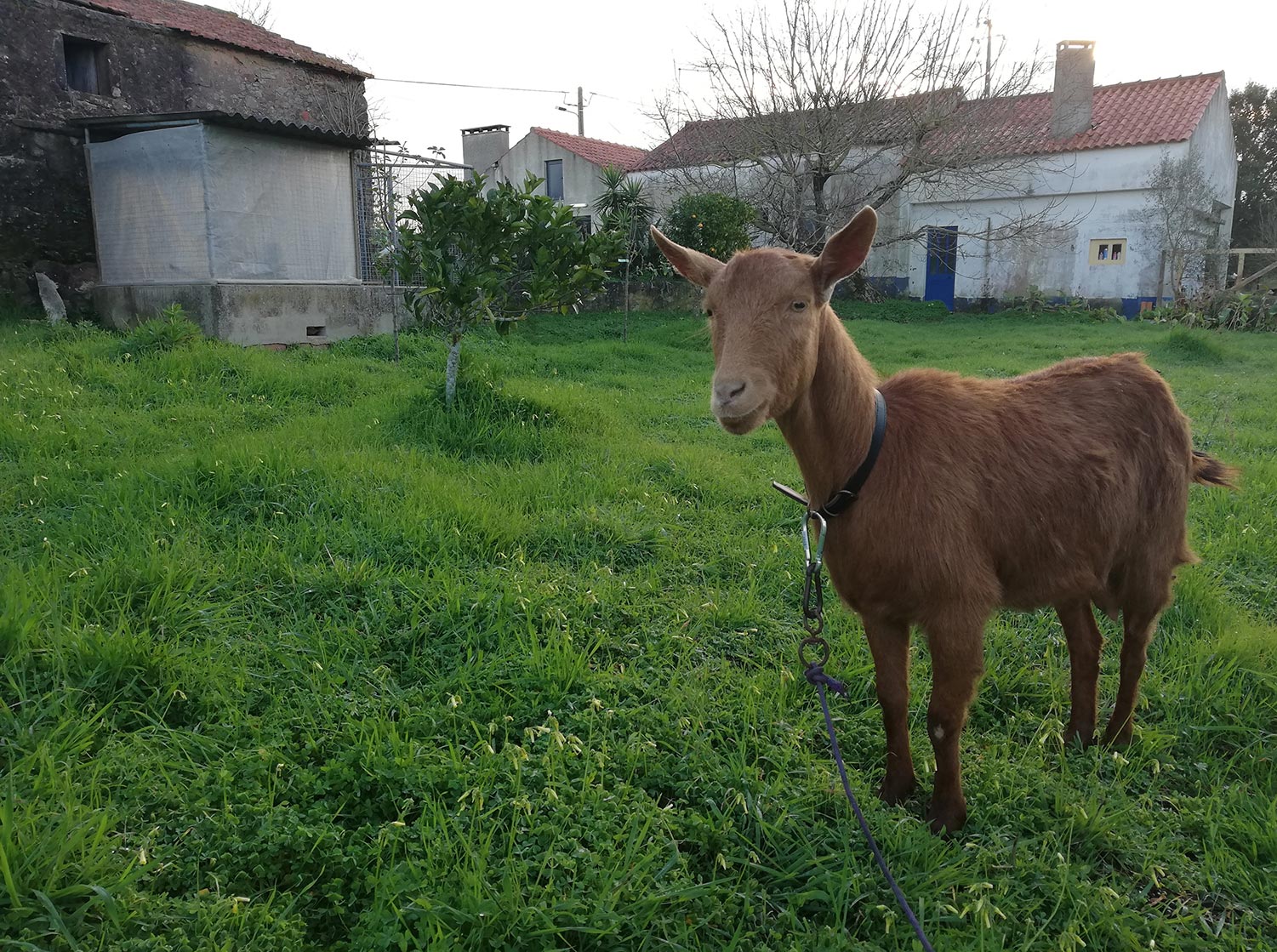 En weer een nieuwe aanwinst! En we noemen haar Lurdes Maria. Een prachtige mooie geit! En nog drachtig ook. Ongeveer half mei kunnen we de babygeitjes verwachten (van een geit heten ze ook lammeren, heb ik vandaag geleerd). Het dier is ongeveer twee jaar oud. We hebben haar gekocht van Gonçalo, die weer een neef van Miguel is. Ik geloof dat iedereen hier een neef van iedereen is, maar dat terzijde. De bedoeling is dat Lurdes Maria het gras kort houdt, dat scheelt een hoop maaien van de zomer. En het staat gezellig ook, natuurlijk, zo’n geit in de wei.