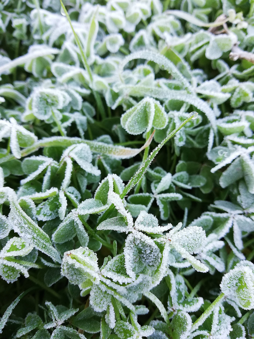 Het is niet het eerste dat je te binnen schiet, als je aan Portugal denkt, maar ’s nachts kan het dus best vriezen. Het is weliswaar uitzonderlijk, maar het is al de tweede nacht op rij. Mooi gezicht hoor, net als de zon opkomt, zijn de velden nog wit en schijnen de eerste zonnestralen laag over het land. De rijp op de klaver begint dan net te smelten.