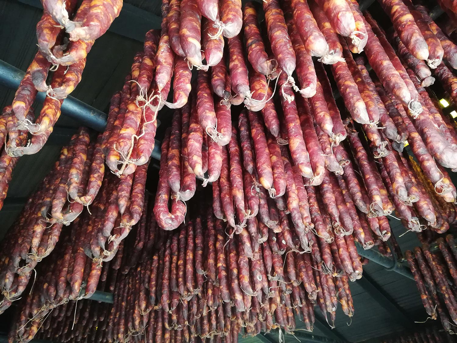 Overal worden om de haverklap feesten gehouden. Vandaag in Peso het feest van de worsten (Festa do chouriço). Je hebt ook het feest van de aardappels, van de sardientjes, van de kool, van het zout. Je kunt het zo gek niet bedenken of er wordt wel een feest voor georganiseerd. Nu moet je feest ruim zien. Het komt erop neer dat er in een zaal lange tafels staan, waar gegeten en gedronken kan worden. Op het feest van de worsten waren wij pas na de lunch, dus de tafels waren al niet meer bezet. Wat er rest is een zaal met lege tafels en mensen die erom heen staan te kletsen. Het is vooral bedoeld als ontmoetingsmoment voor alle dorpen uit de buurt. En natuurlijk kun je er worst kopen. In de ruimte naast de feestruimte hangen de worsten aan het plafond. Normaal wordt er vuur gestookt zodat de worsten gerookt worden. Nu is dat al gebeurd. Er wordt brood gebakken, in steenovens. Er zijn twee ovens naast elkaar, in één brandt er een flink vuur, de ander wordt door de bakker schoongemaakt: de nog smeulende stukken hout worden uit de oven gehaald en in de oven er pal naast gestopt. Daarna wordt de as uit de oven geveegd met een bezem van rozenmarijntakken die nat gemaakt zijn in een emmer water. Op de zo geveegde ovenvloer wordt het deeg gelegd in mooie bergjes. Het deeg wordt aangereikt door twee vrouwen. De ene pakt het natte deeg uit de deegtrog, de ander legt het in bloem zodat het aan te pakken is en die geeft het dan weer aan de bakker die het de hete oven in schuift. Een mooi samenspel.
