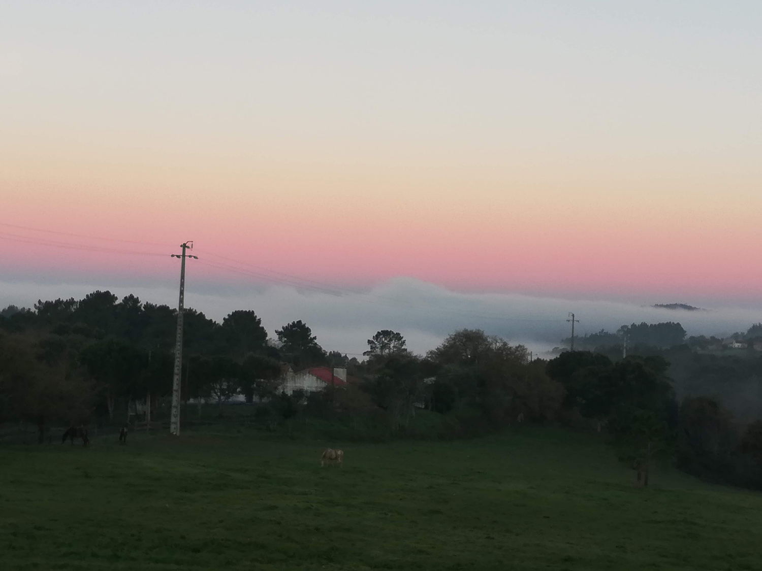 Dat is nou eens geluk hebben! Ons huis ligt kennelijk precies op een grens. Dat wil zeggen, achter het huis in het dal begint de mist, die zo te zien zich helemaal uitstrekt tot de zee. Het gebeurt wel vaker dat het bij ons zonnig weer is en dat de hele kuststrook in de mist zit. En vandaag lijkt wel weer zo’n dag. Meestal betekent dit dat er een zonnige dag aankomt. We gaan het zien.