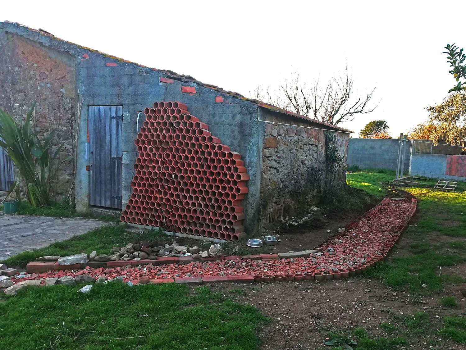 Begin december zijn we begonnen aan het pad langs het oude huis. Door Kerst, bezoek, regen kan er niet elke dag aan gewerkt worden, maar vandaag met Arthur hebben we weer een flinke slag geslagen! Achter het oude huis lag een flinke berg met dakpannen, bakstenen en holle terracottastenen. Veel zijn kapot. De kapotte vinden hun weg naar het pad en de hele zijn gesorteerd en opgestapeld. De berg is weg! Het pad loopt nu voorbij het oude huis en dat betekent dat het meest drassige gedeelte nu voorzien is van een stenen laag. De bedoeling is dat we een flinke onderlaag hebben van terracotta scherven, waar we dan later grind op leggen. We zijn nu een flink end op weg. Ook al hebben we de grindlaag nog niet, het pad is al begaanbaar.