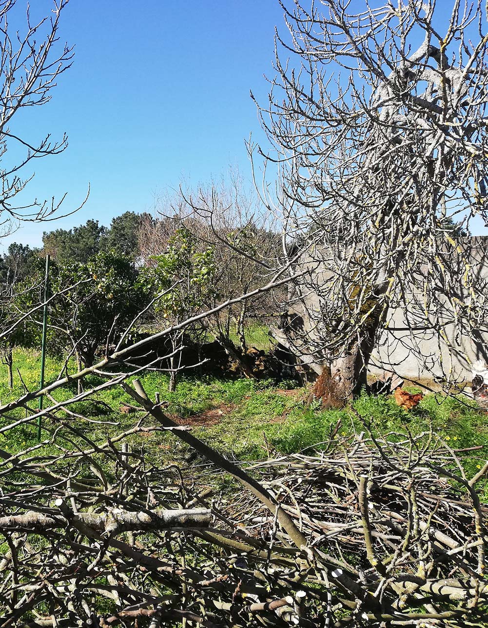 Achter het oude huis staat een vijgenboom van misschien wel honderd jaar. Helaas is er de afgelopen decennia geen aandacht aan besteed en de boom is dwars door andere bomen heengegroeid. We hebben een grote dwarstak eraf gehaald, met beleid, om de andere bomen niet te beschadigen. Nu kunnen we de citroenboom die er achter staat weer goed zien. En de vruchten die hij draagt! De oude vijgenboom is waarschijnlijk erg aangetast door houtrot en boktor, maar hij zal nog wel een paar jaar blijven staan. We gaan hem proberen te redden, in ieder geval in vorm snoeien, opdat hij er niet zo vormeloos uitziet.
