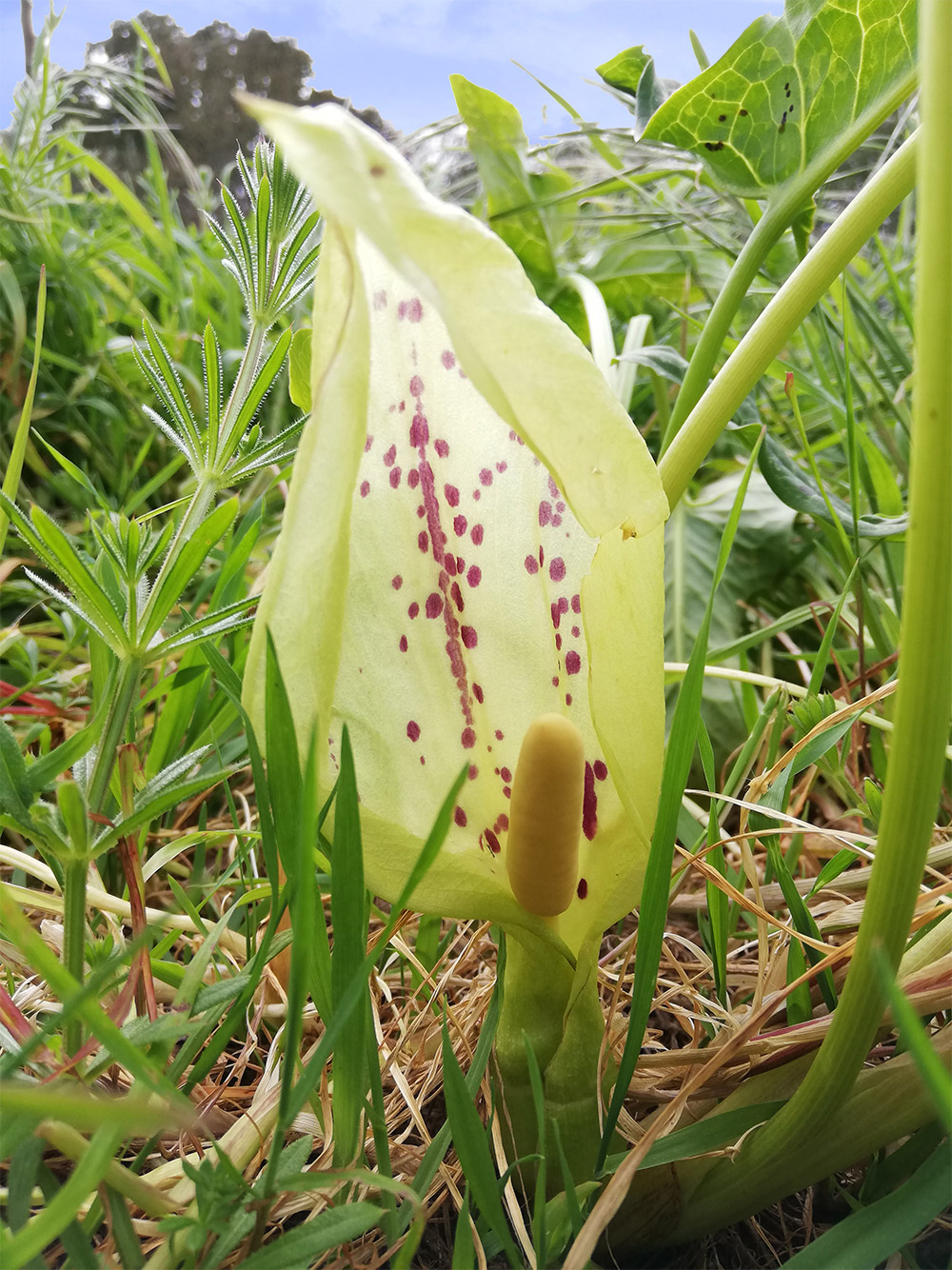 Moeder Natuur kan zo vriendelijk zijn. Zomaar spontaan kwam deze bloem opzetten. Er moest even wat opgezocht worden, maar dit is de Gevlekte Aronskelk (Arum Maculatum), en die komt spontaan op, op ons terrein. Geen idee of het een zeldzame plant is, maar ik heb hem nog nooit gezien. Wel die witte, die zie je wel in tuincentra in Nederland, als kamerplant. Volgens de site die ik bezocht heb, groeit-ie meestal in groepen, dus we kunnen er nog meer verwachten. Voorlopig genieten we van deze.