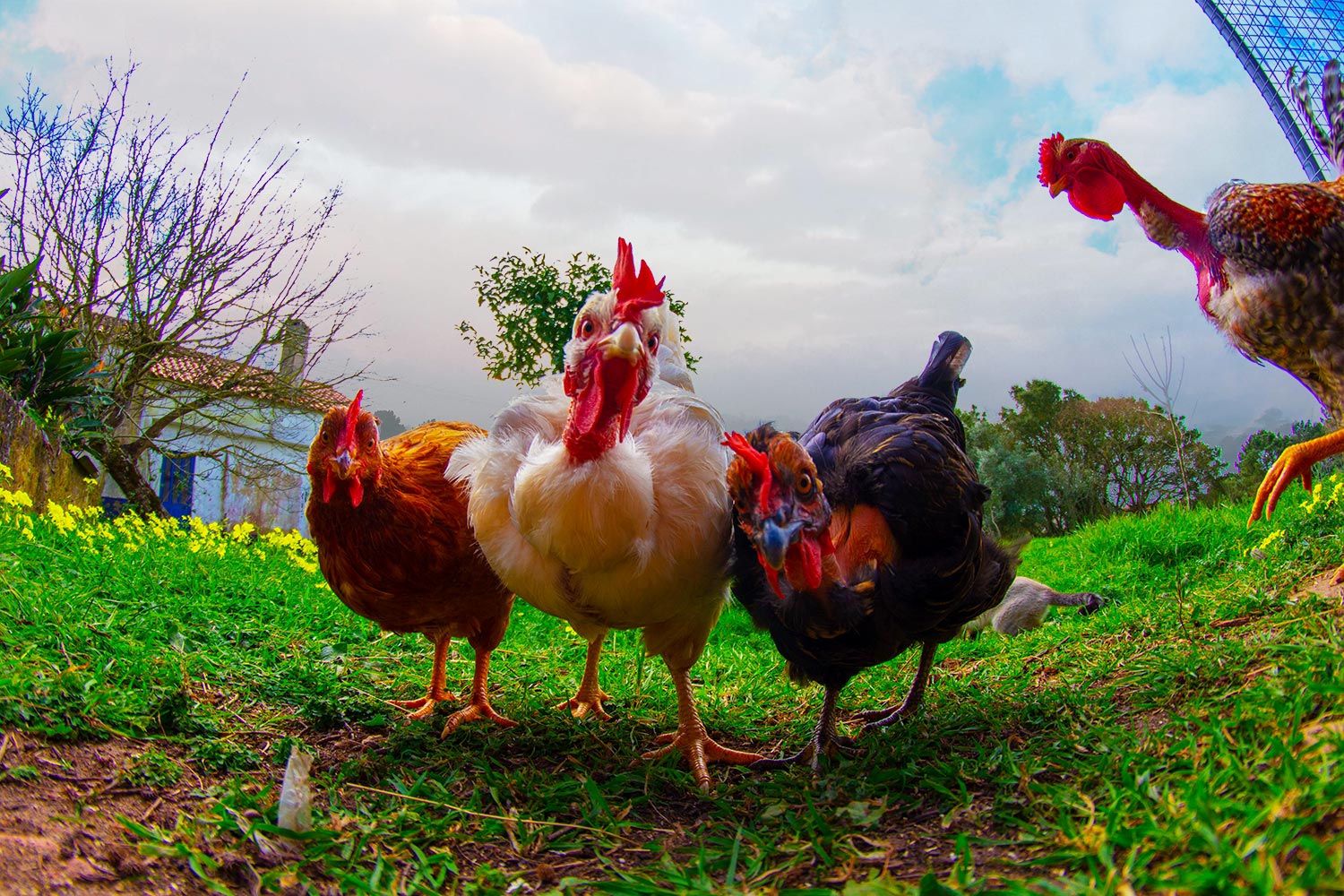 Er als de kippen bij zijn. Dat is een prachtige Nederlandse uitdrukking, en hier kun je die elke dag in de praktijk gebracht zien. De kippen lopen vrij rond, en als je in de richting van hun hok loopt, komen ze aangerend en -gevlogen, bang om iets van eventueel voedsel te missen. ’t Zijn heel gezellige dieren: als je op het terrein ergens aan het werk bent, komen ze altijd in de buurt scharrelen. En als je wat op de grond aan het rommelen bent, zijn ze erg nieuwsgierig wat je allemaal aan het doen bent. Ze blijven wel op armslengte afstand, ze willen niet aangeraakt worden.