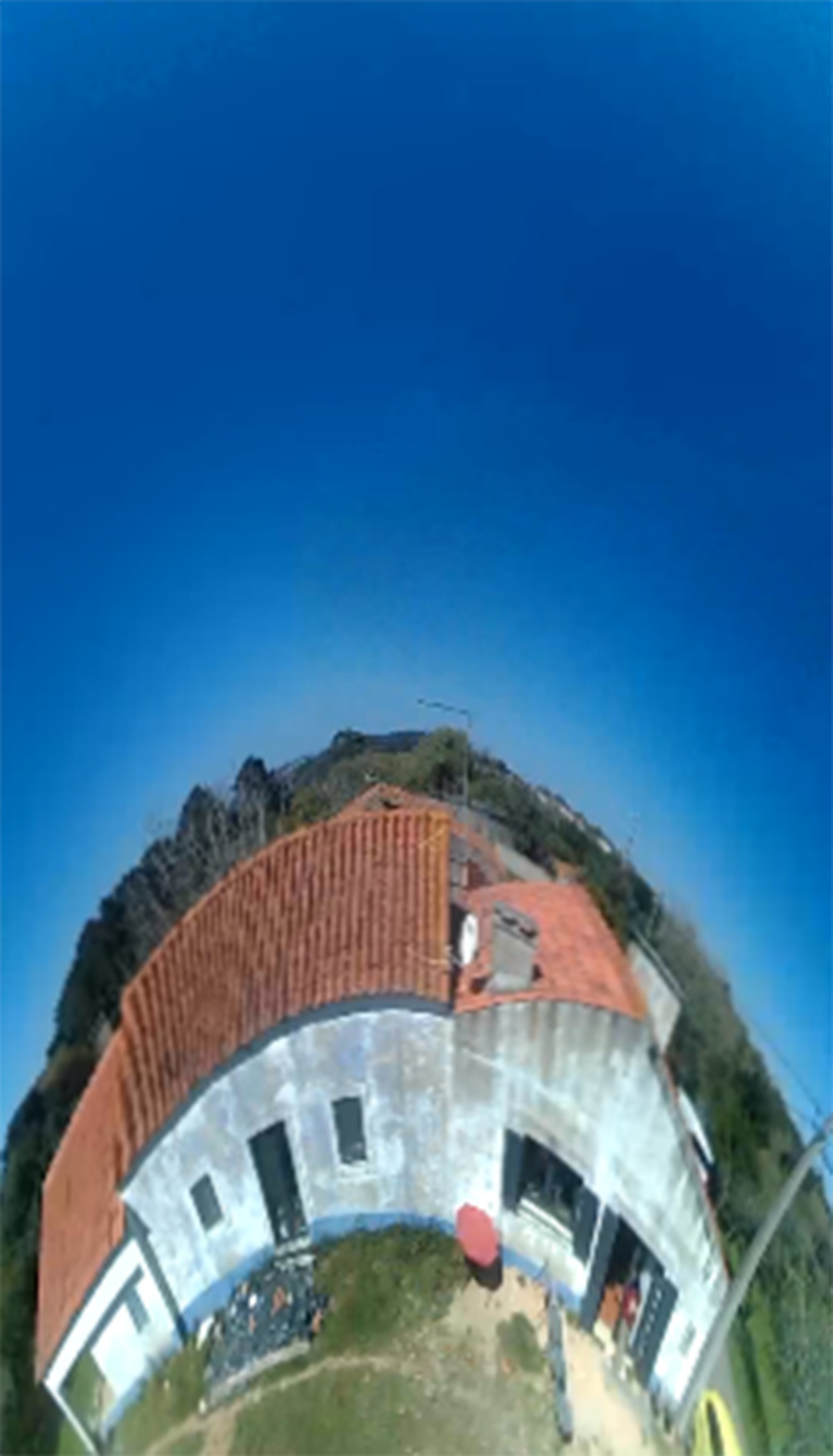 Marijn heeft een actiecamera. zo een die je overal aan vast kunt maken. Als je het ding op video zet, en je gooit hem in de lucht dan krijg je bijzondere effecten. Uit het filmpje kun je dan weer een still halen, en dat levert een grappige foto op, waarmee je een overzicht krijgt van het huis en het terrein erachter. Wel flink vervormd, maar dat draagt wel lekker bij aan het vervreemdende effect.