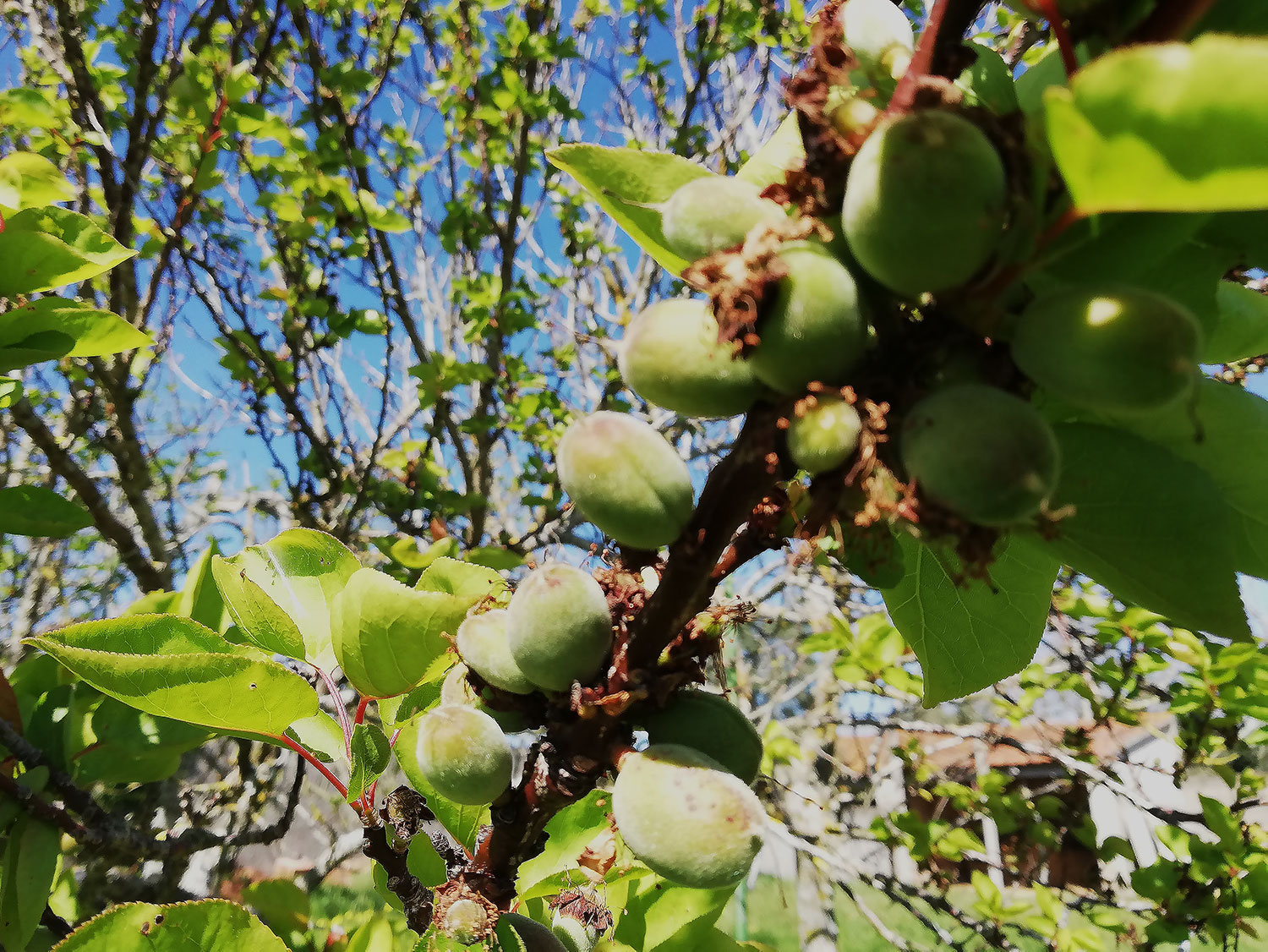 De perzikenboom is uitgebloeid en begint nu vruchten te dragen. Er zitten ontzettend veel vruchten aan de boom. Ik ben benieuwd of-tie ’t straks wel houdt. Voorlopig is het afwachten en Lourdes Maria van de boom weghouden, want die vindt die beginnende vruchten wel lekker. Als we haar ’s avonds binnen zetten, moeten we altijd langs de boom en dan is ze lastig in toom te houden. ’t Lukt wel, maar je moet op je hoede zijn.
