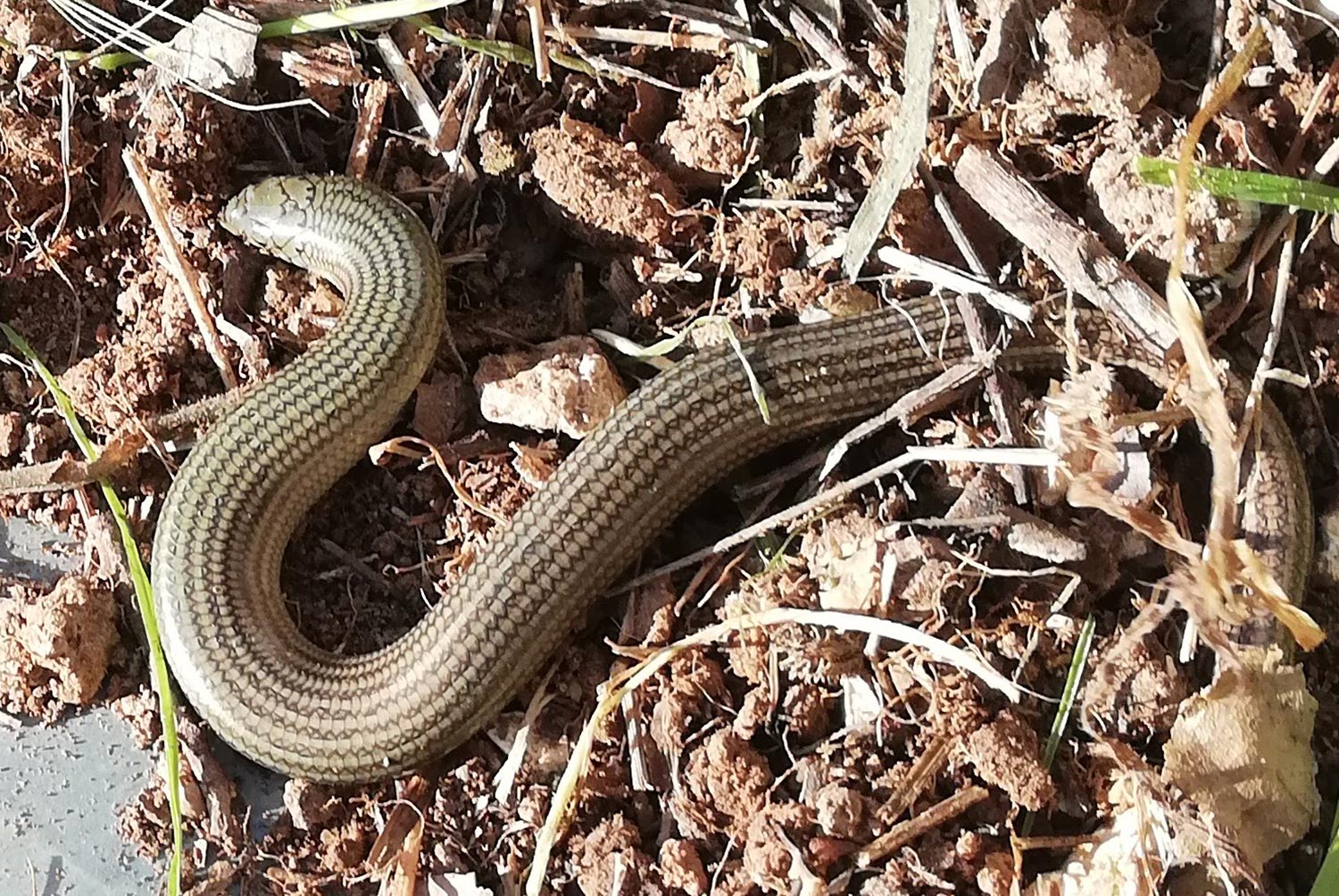 Bij het legen van de kruiwagen op de composthoop kwam ineens deze hazelworm tevoorschijn. In eerste instantie schrik je je dood want het lijkt op een klein slangetje. Weet jij veel of die giftig is of niet. Niets aan de hand, het is een hazelworm; dat is een hagedis waarvan de poten weggeëvolueerd zijn. Had ik nooit gezien, en nu gewoon op ons terrein!