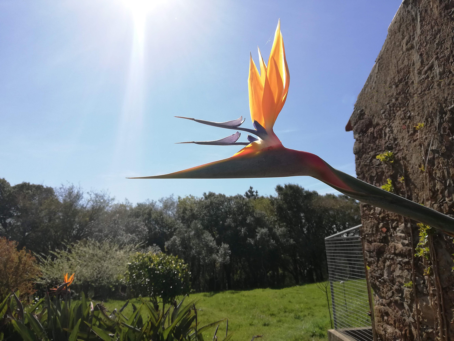 Voor het oude huis staat een enorme plant die op een prachtige manier bloeit: De Paradijsvogelbloem (Strelitzia Reginae). De bladen zijn loeischerp, dus je moet goed uitkijken als je er langs loopt. Maar de bloem is echt geweldig. Hij wordt ook wel Vogelkopbloem genoemd, en je kunt wel zien waarom. Ik ken die namen ook niet zo maar, hoor. Ik zoek het op en zo word je ook wat wijzer.