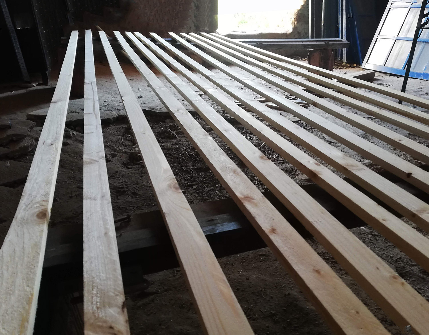 In het gedeelte van het terrein waar de honden lopen, willen we een stukje met wilde bloemen aanleggen, om de bijen een beetje te helpen, voor de biodiversiteit en gewoon omdat dat mooi is. Om te voorkomen dat de honden alles plat gaan lopen, gaan we er een rustiek hekje omheen plaatsen. Het hekje wordt gemaakt van latten, waar we takken tegen aan gaan schroeven. De latten hebben we gisteren gekocht en vandaag hebben we ze behandeld met een soort antischimmel-, antihoutrot en antihoutwormmiddel. Het oude huis is daartoe even omgebouwd tot werkplaats. Van stenen en oude deurposten een soort van stellage gebouwd waar de latten op kunnen drogen.