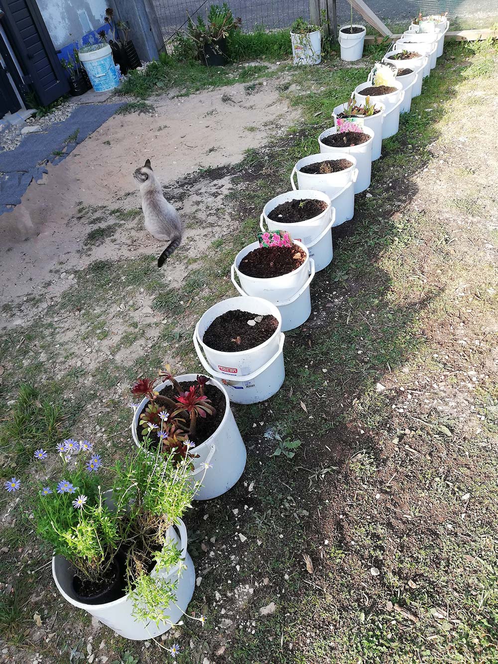 De emmers die we hebben gekregen van onze Indiase vrienden, zijn schoongemaakt en ze hebben lekker staan drogen in de zon. In de bodem hebben we gaatjes gemaakt. De emmers zijn voorzien van een laag puin, en daarbovenop tuinaarde. Hierin zijn de stekjes gezet die de afgelopen periode zijn gevonden, gekregen of gewoon gestekt. De emmers staan nu keurig op een rij het terras te vormen. De honden snappen al vrij aardig dat dat voor hun een barrière is, waar ze niet overheen mogen. Dat wil zeggen, als we erbij zijn. Het gebeurt nog wel dat we als we een uurtje weggeweest zijn en terugkomen, een net gepot plantje een stukje verderop zien liggen. Maar dat leren we ze nog wel. We hebben in ieder geval geen last meer van honden die onder de tafel gaan spelen als we net buiten koffie aan het drinken zijn. Dat geeft dan weer rust!
