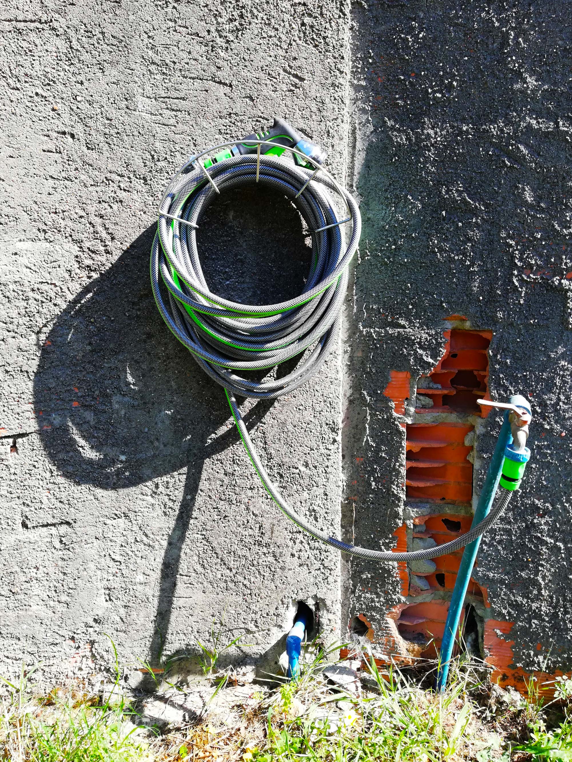 De andere punten zijn voorzien van tuinslangen, en vandaag zijn de beugels aan de muur gezet om de slangen aan op te hangen.