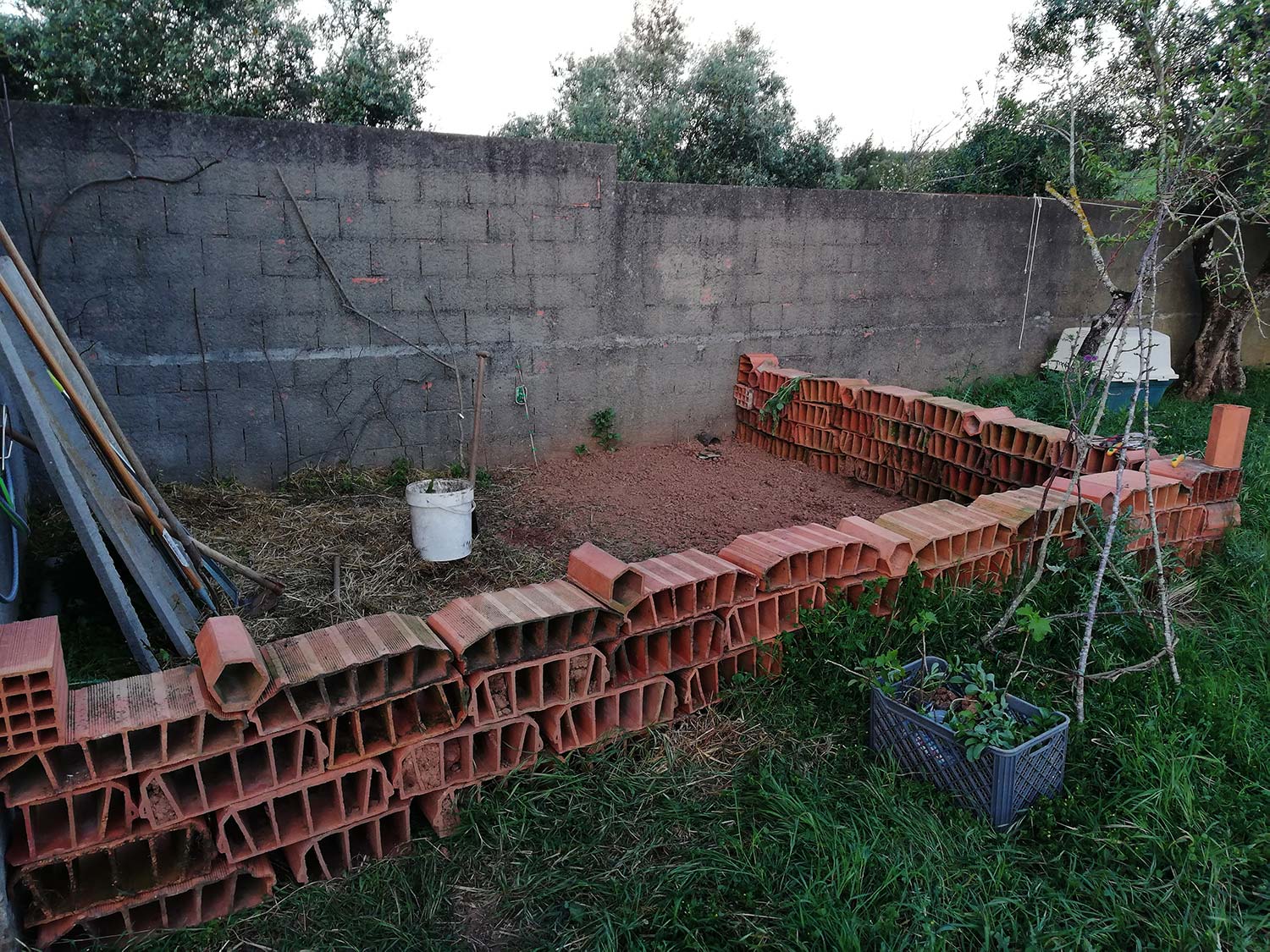 We zijn begonnen aan de moestuin. Hij was er eigenlijk al, er stonden een paar bessenstruiken en kiwiplanten. De grond hadden we bedekt met stro dat uit de geitenstal kwam, als we die schoonmaakten. De bedoeling was dat er dan een humuslaag ontstond zonder al te veel onkruid. Nou, dat is vrij aardig gelukt. De laag die onder het stro kwam was in eerste instantie erg in trek bij de kippen, die al het beginnend onkruid eruit pikten. Nu komt het probleem dat ze er niet in mogen als we serieus gaan zaaien en planten. We hebben van de plafondstenen die we her en der op het terrein vonden een muur gemaakt. Dat houdt in ieder geval de honden tegen als die elkaar achterna zitten. We hopen dat de kippen op het terrein verder genoeg vinden, dat ze het niet de moeite waard vinden over het muurtje te fladderen. Of het gaat werken weten we pas over een tijdje.