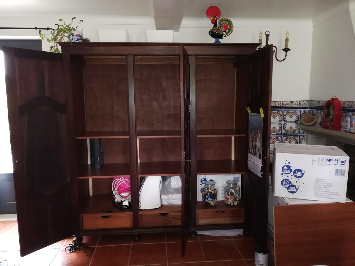 Het regent. Een mooi moment om binnen eens wat te doen. We hadden de planken voor de kast al in huis gehaald. Op maat gezaagd door de Aki. Net als in Nederland wordt het gratis voor je op maat gezaagd als je een klantenkaart hebt. En die hebben we. Op de foto lijkt het één grote plank te zijn, maar dat is niet zo, hij is in drieën, anders krijg je hem er niet in. Het probleem zit hem niet in het op maat krijgen van de plank, maar de hoekjes die eruit moeten om hem tussen de staanders te krijgen. Dat is nog een heel gedoe. Ook al teken je het af en neem je de maat, het klopt steeds net niet, het is nu eenmaal een handgemaakte kast en geen fabriekskast. Het gevolg is dat de maten voor en achter nét niet hetzelfde zijn. Ik zaag de hoekjes in, in het oude huis, dus het is veel heen en weer lopen. Goed voor het stappentotaal. Doordat het regent is het wel af en toe een frisse boel, maar echt koud is het ook weer niet.