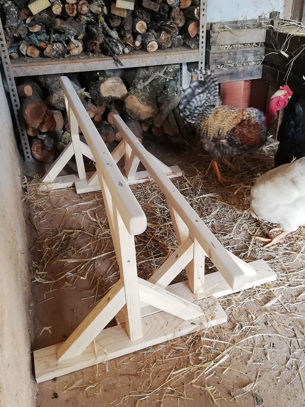 Om ze ’s nachts goed op stok te kunnen laten gaan hebben we zitstokken gemaakt. Deze staan nu op z’n plek, de kippen mogen een nachtje proefdraaien en morgen kunnen we ze dan behandelen met houtbescherming.