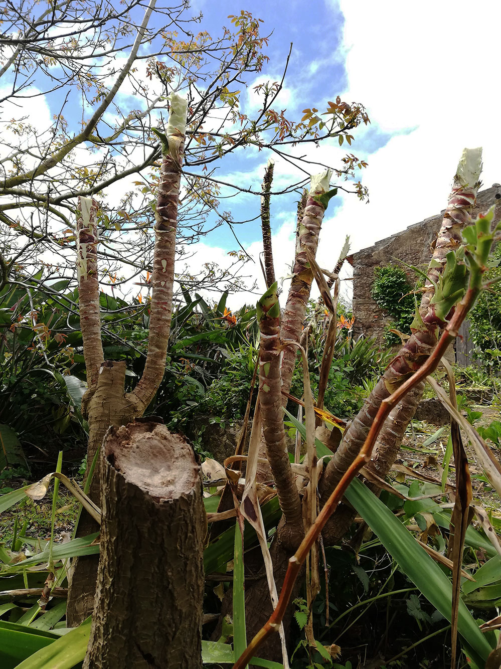 De vorige bewoners hebben waarschijnlijk ooit een idee van een siertuin gehad. Een stuk grond vlak voor het huis is voorzien van een viertal van ruwe stenen gemetselde bakken. De bakken waren in eerste instantie niet goed te zien, helemaal overgroeid met bramen, brandnetels en ander spul. Marie-José is een jaar geleden aardig bezig geweest en heeft het stuk goed vrijgemaakt. De palmlelies stonden nog steeds in de bakken. Enorme grote planten van tegen de twee meter hoog en vervelend stekend blad. We zijn vandaag begonnen met de bladeren eraf te halen. Dan hou je een grote knol en flinke staken over. Twee van die knollen hebben we er uitgehaald, een van de twee was bijna zestig centimer in doorsnee, één grote bonk ingebed in aarde die aan de worteltjes blijft hangen. Het duurde even voordat we die losgehakt hadden, maar uiteindelijk is het gelukt. Morgen de andere twee.