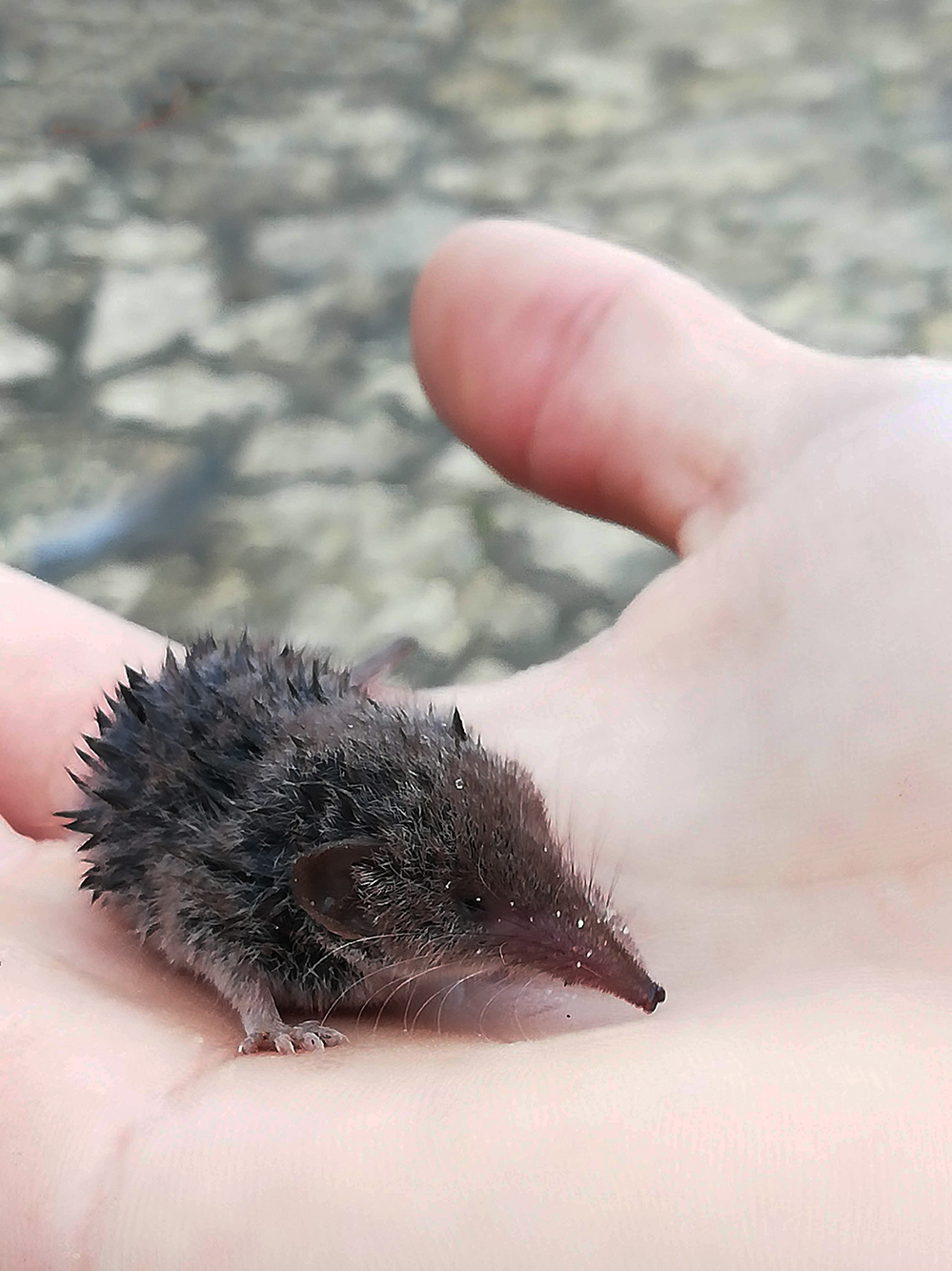 Zo klein, zo fragiel. Deze heeft het jachtinstinct van onze katten overleefd. Natuurlijk zitten er op het terrein grote aantallen van deze diertjes en we vinden ze ook regelmatig terug als kattenprooi, maar deze is ontsnapt. Het is een nog jong exemplaar en misschien is-tie wel zo geschrokken dat hij beter oplet in het vervolg.