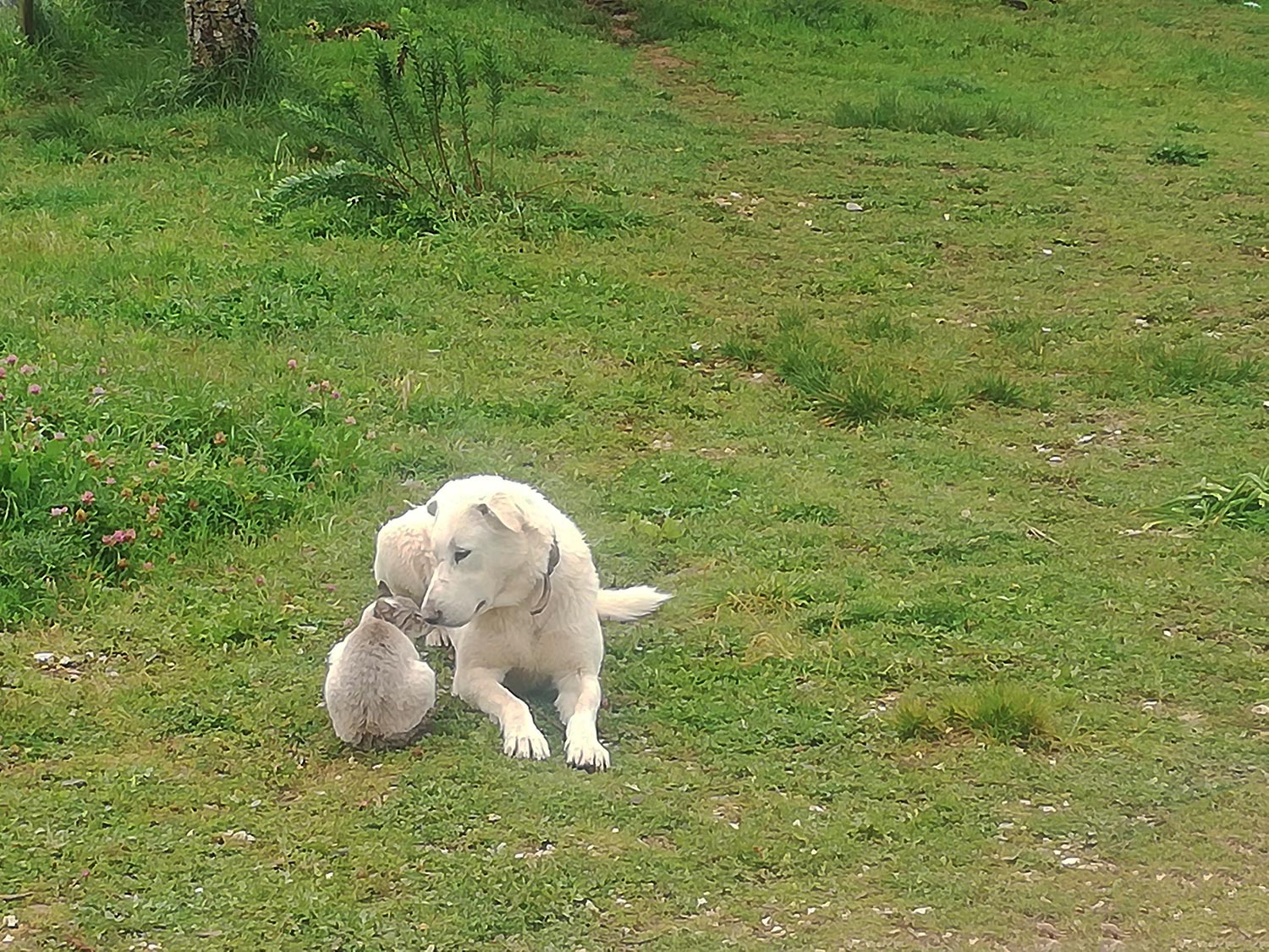 Max en Gaia zijn goede maatjes. De ene keer zit Max haar achterna en moet ze vluchten in een hoge boom, waar ze dan ontstellend klaaglijk kan gaan zitten mauwen, alsof ze er al weken zit en omkomt van de honger, de andere keer zit Gaia Max kopjes te geven en gaat ze bij hem liggen alsof hij de grootste beschermengel is die je je maar kan voorstellen. Gaia is ook degene die steevast meeloopt as we de honden gaan uitlaten. Ze is scheel en waarschijnlijk ziet ze niet goed. We hebben haar al eens naar een grote steen zien springen die ze gewoon miste. Het gebeurt ook wel dat ze op de bank wil springen en niet ziet dat de kastdeur openstaat. Ze springt dan vol met haar kop tegen de onderkant van de kastdeur. Zielig, maar wat doe je eraan. Als ze dan meeloopt moeten we haar steeds roepen als ze een beetje achterloopt anders is ze ons kwijt, maar meestal loopt ze voor ons uit of tussen de honden in. Wel zo veilig…