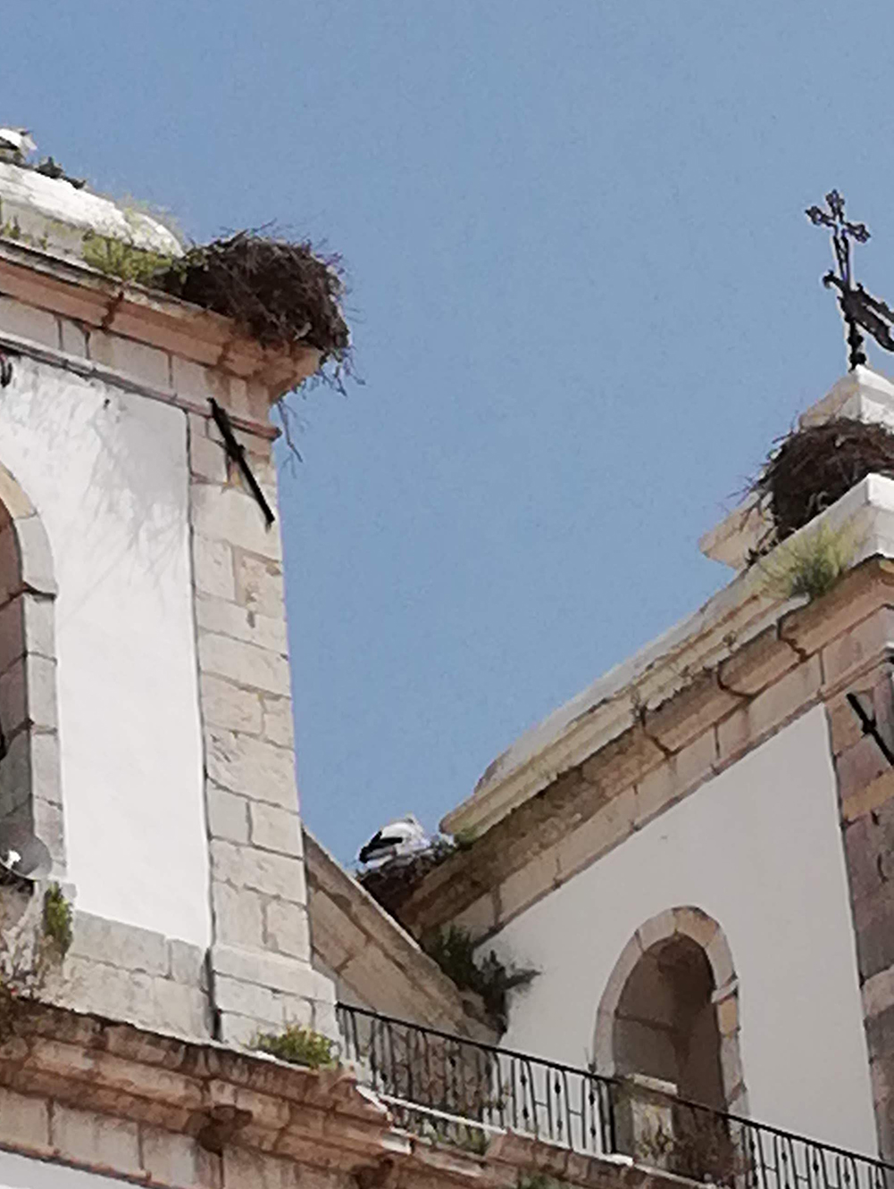 We hebben een uurtje door de stad geslenterd en zagen ondermeer deze ooievaarkolonie bovenop de twee torens van een kerk. We konden drie nesten van beneden zien, waarvan zeker een bezet. We vroegen ons af of de ooievaars gewend zijn aan het gelui van de klokken die er vlak onder zitten.