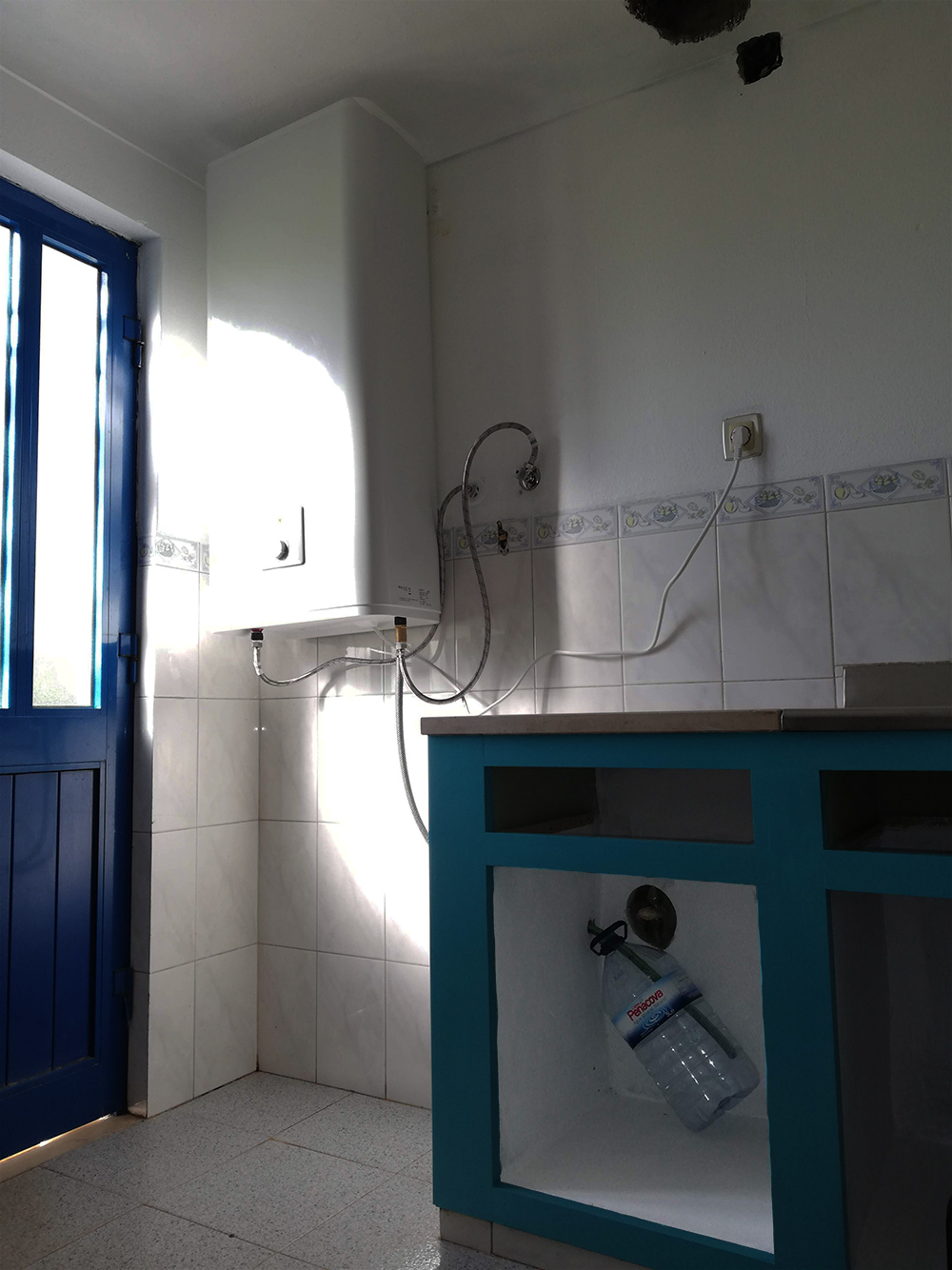 Uiteindelijk hangt de boiler, op het oog scheef, want de wanden zijn loodrecht en de plint in het plafond is ook niet waterpas. Het lijnenspel met de aansluitingen is ook echt Portugese stijl. De afvoer voor de druppelaar gaan we ook niet aanleggen, alles is tenslotte tijdelijk, dus hiervoor volstaat een tuinslang en waterfles. Alles echt op authentiek Portugese manier! Het motto is: het werkt, dus is het goed.
