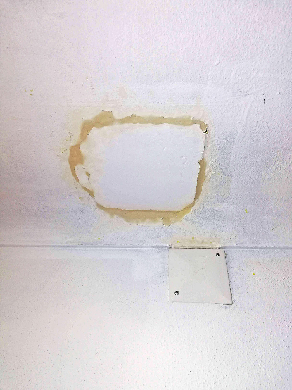Op de plaats waar de geiser hing in het appartement, zat een ernorm gat in het plafond voor de rookafvoer. Nou ja min of meer op de plaats van de geiser. Eigenlijk meer dertig centimeter ernaast, waar een afzuigkap ooit gepland was, maar nooit gekomen. De vorige bewoners hadden met een flexible buis een provisorische afvoer gemaakt. Natuurlijk paste het niet helemaal, dus de buis was platgeslagen en hing tegen de zijkanten van het gat. Boven het gat is een pijp gemetseld die in de ruimte boven eindigt. Waarom die niet naar buiten is doorgetrokken weet ik niet.