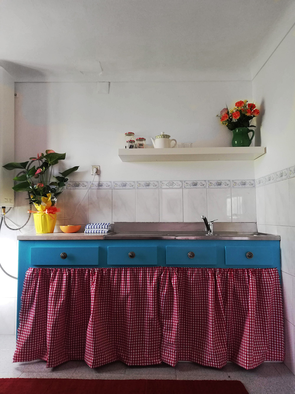 En het is klaar. Het gordijntje hangt. De spandraad wordt in het midden opgehouden door een spijkertje. ’t Zou een haakje moeten zijn, maar de haakjes die ze verkochten bij de chinees zijn niet goed genoeg voor het harde hout van de keuken. Ze breken af bij het indraaien. Eigenlijk zou er een klein gaatje geboord moeten worden, maar in Benedita is een boortje van 1,5 of 2 mm niet te vinden. Zelfs niet bij Luis e Morgado, de Schous van Benedita. Dan maar een klein spijkertje, dat werkt ook. Dus: de laatste hand gelegd, schoonmaken, stofzuigen, gereedschap weg en klaar voor Amber en Lucinda, die morgen komen. Zoals eerder gezegd, het is net Ik vertrek, met de deadline van gasten die komen.