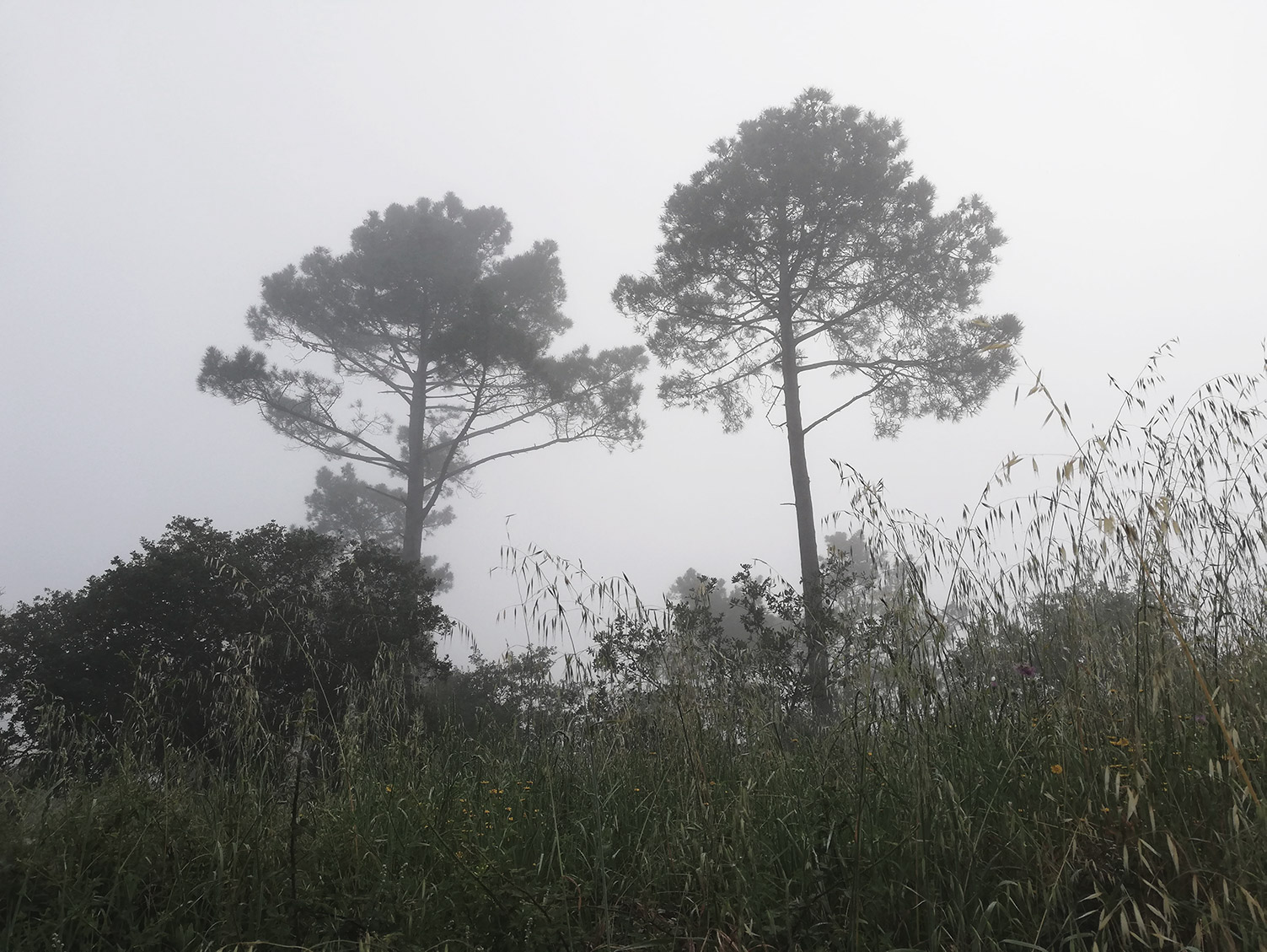 In de ochtend kan het ook flink misten. Deze bomen staan langs de ronde die we ’s ochtends doen. Het zijn majestueuze bomen. Normaal vallen ze een beetje weg tegen de achtergrond, maar door de mist is die nu weg.