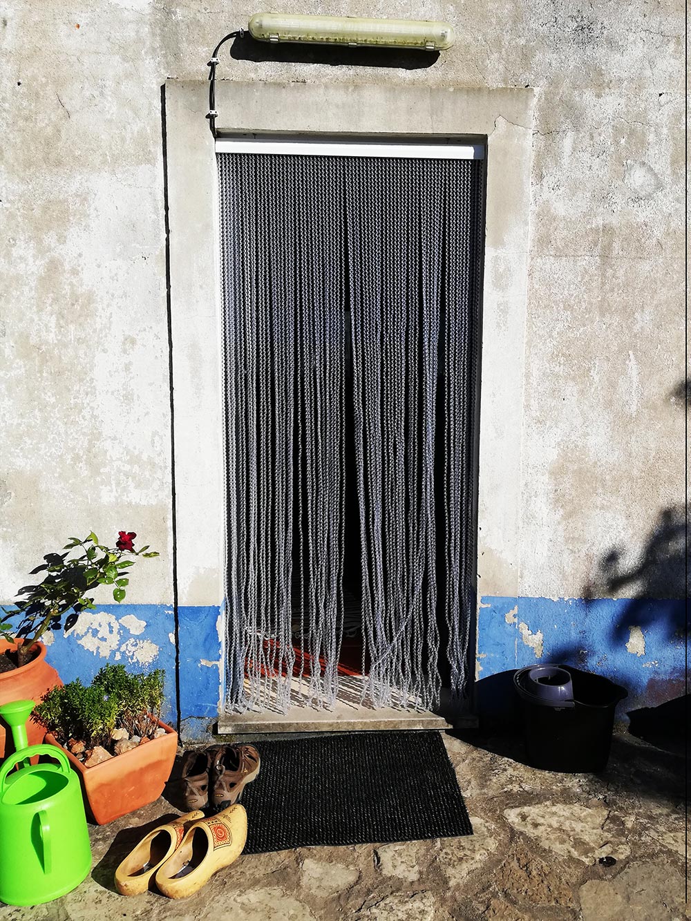 Maar om te vermijden dat ze te veel naar binnen komen hebben we een vliegengordijn opgehangen. Er heeft vast wel eens eerder zoiets gehangen, want er zaten al plugjes boven de deur, die we zo konden hergebruiken. Nu met deze doorzichtige wokkels voor de deur hebben we een stuk minder last van vliegen binnen en het houdt ook de warmte tegen, zodat het binnen toch relatief koel blijft. ’t Ziet er misschien niet uit, maar het is bijzonder effectief!