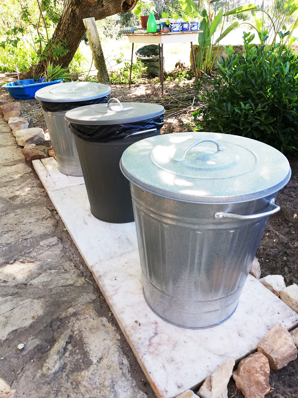 Buiten hebben we drie vuilnisbakken staan, waarin we het afval scheiden: plastic en metaal, papier en glas en restafval.