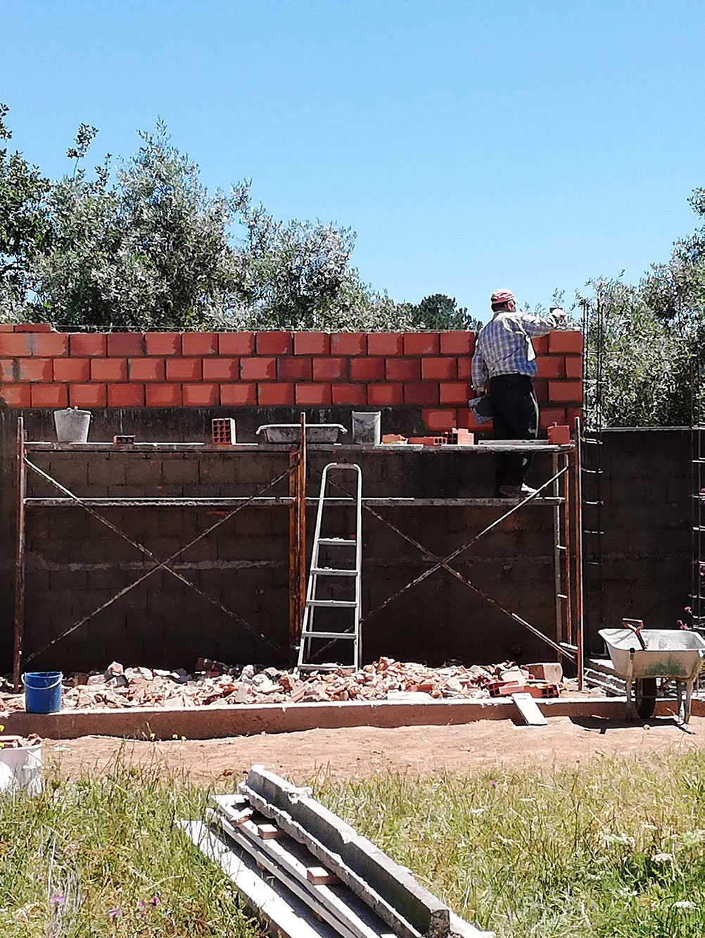 Het was een hete dag, zo’n dag dat je zoveel mogelijk uit de zon loopt. Maar Ilídio niet, hij staat in de volle zon gestaag door te werken en je ziet de muur onder zijn handen groeien.