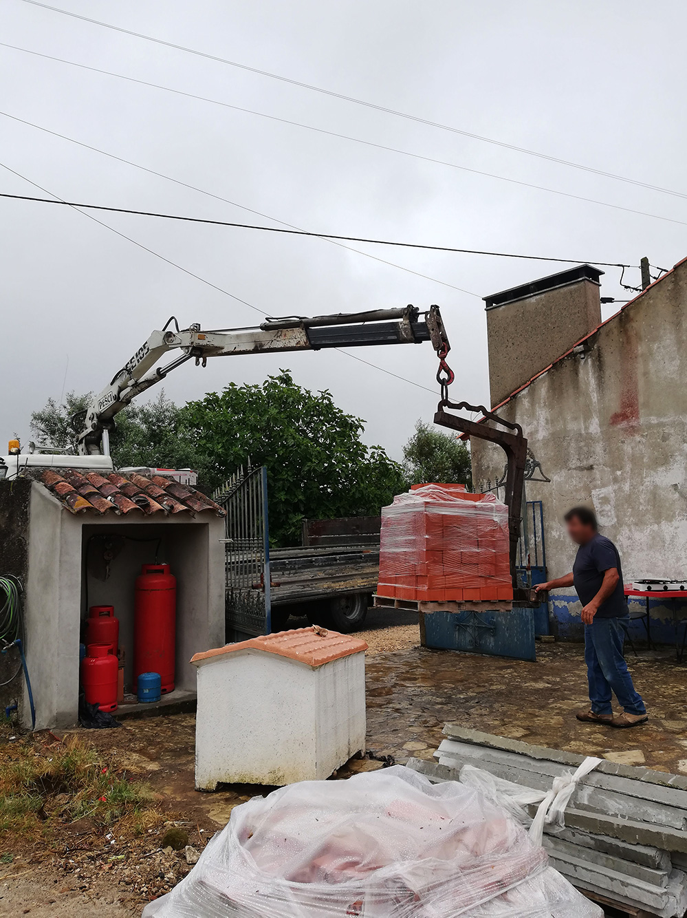 Het wordt nu serieus! Er worden grote bouwmaterialen aangeleverd. Dakpannen voor de uitbouw en de liggers die het dak moeten dragen. Dat kan allemaal niet zomaar getild worden en met een vrachtwagen met een hijsarm wordt het op het pleintje gezet. Nog een heel gedoe, want voor ons huis lopen allerlei draden, waaronder de glasvezelkabel voor het internet. In Portugal hangt dat allemaal in de lucht en het is dus kwetsbaar. De kraan moet eronderdoor, met behulp van een bezem en een lange lat wordt de kabel omhoog gehouden, zodat de arm eronder door kan. Vervolgens wordt die arm helemaal uitgeschoven en de pallets met dakpannen worden zo neergezet. De langste draagbalk wordt meteen op zijn plek gezet, hiervoor wordt de vrachtwagen een stukje verder gezet en de hijskraan tilt hem over de muur heen op zijn plaats. Ilídio loopt er gewoon onder en staat met zijn armen in de lucht het ding op zijn plaats te duwen. Je houdt je hart vast, want de hijskraan is geen precisieinstrument, de draagbalk ligt maar een paar millimeter op de steunpilaar en Ilídio staat er pal onder. Joaquim staat er een beetje bij te lachen. “Ach, dat is normaal”, zegt hij, “we zijn het gewend. En ik heb nog vijf broers!”