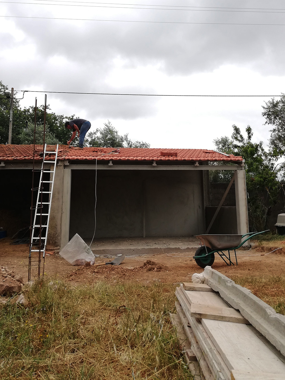 Het dak zit erop. Het hoogste punt is nog net niet bereikt want de nok moet er nog op, maar de dakpannen liggen. We kunnen nu echt van een afdak spreken. Het is nodig ook, want vanmiddag begon het erg hard te regenen. De mannen zijn ook vroeger naar huis gegaan, want werken met cement in de regen is natuurlijk niks. De regen is op zich wel goed, want er moet nog veel grond afgegraven worden en de klei wordt zacht als het nat is. We waren al begonnen met afgraven en we sproeiden steeds een beetje, maar een regenbui van een paar uur, daar valt niet tegen op te sproeien.